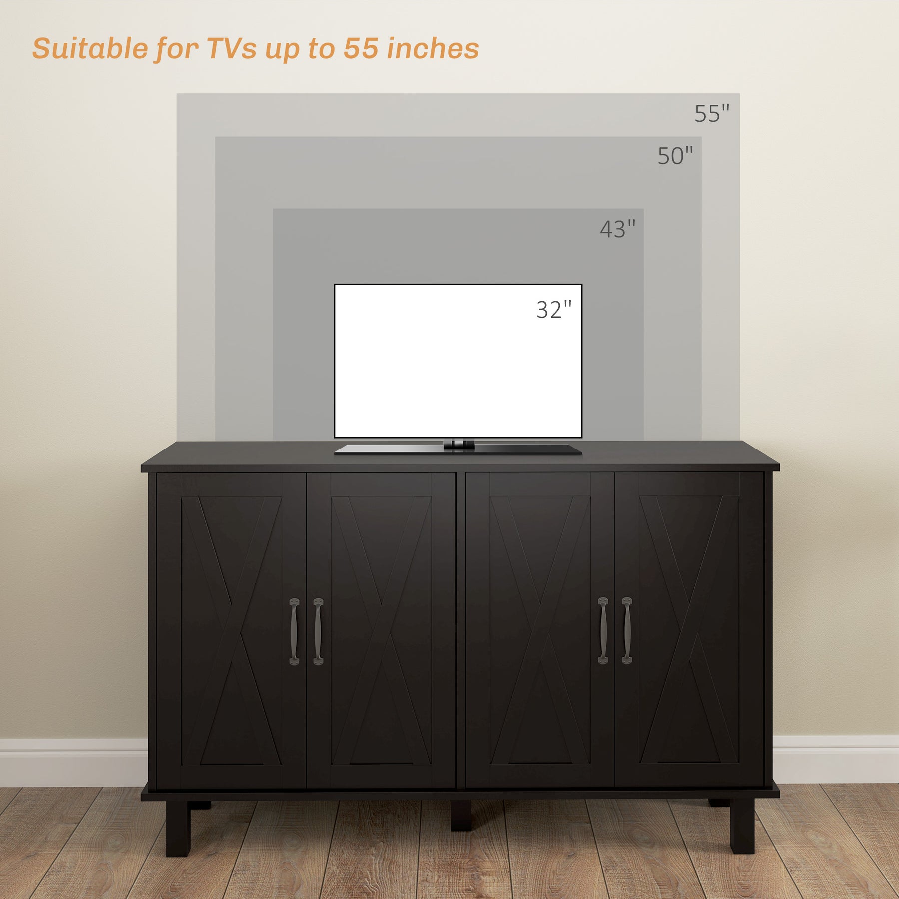 Revamp your living space with the HOMCOM farmhouse sideboard buffet! Organize your dinnerware, pots and pans with ease by using the 4 compartments. Also, you can tailor storage needs with 2 adjustable shelves inside the buffet. This kitchen sideboard with barn doors is bound to instantly upgrade your dining room, living room, or entryway with its farmhouse appearance and versatile storage. Whatever your storage needs, this buffet cabinet will house all the essentials with functional finesse.