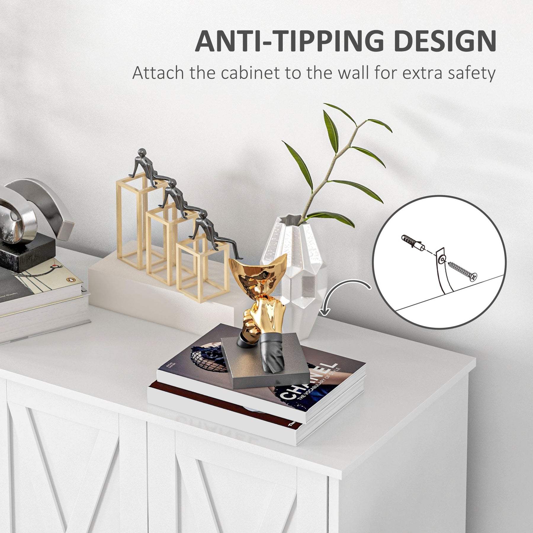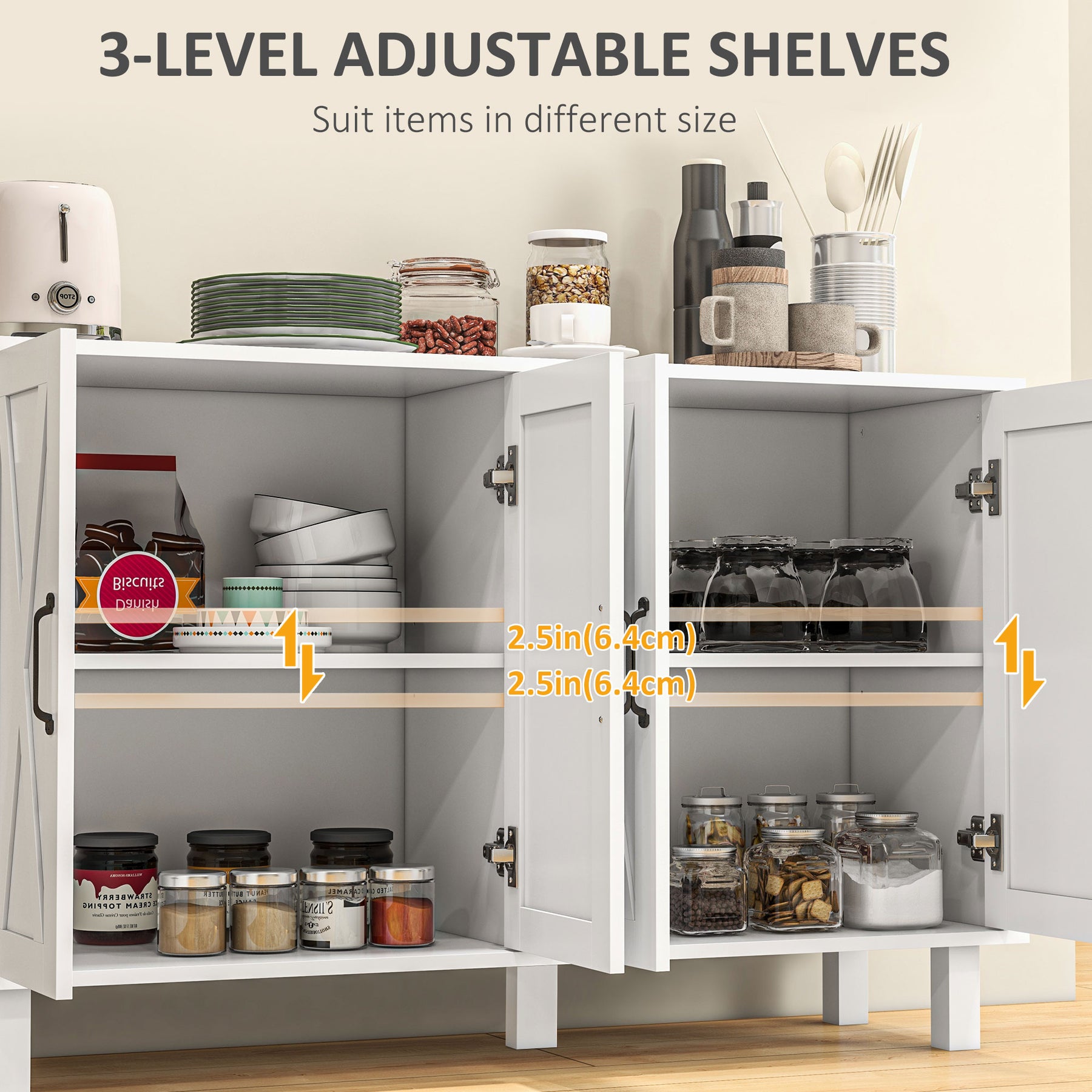 Revamp your living space with the HOMCOM farmhouse sideboard buffet! Organize your dinnerware, pots and pans with ease by using the 4 compartments. Also, you can tailor storage needs with 2 adjustable shelves inside the buffet. This kitchen sideboard with barn doors is bound to instantly upgrade your dining room, living room, or entryway with its farmhouse appearance and versatile storage. Whatever your storage needs, this buffet cabinet will house all the essentials with functional finesse.
