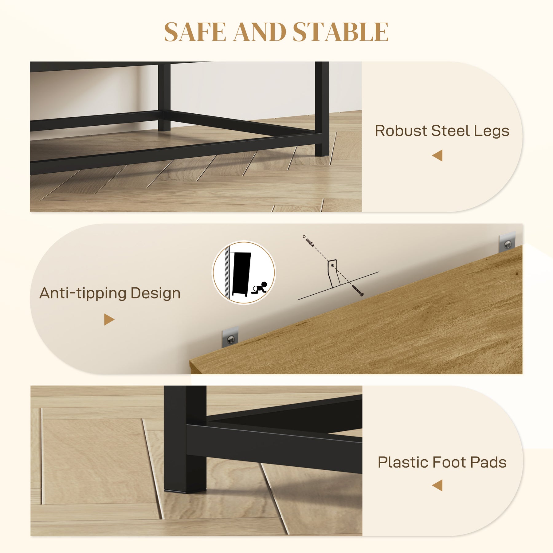 - • Anti-tipping design and plastic foot pads enhance safety