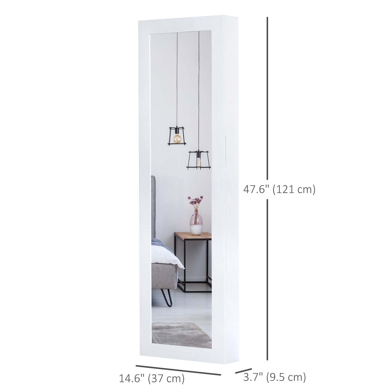 Keep jewelry, perfumes, make-up and accessories organized and easily accessible with this HOMCOM wall jewelry organizer. On the outside, a full-length mirror is ready for your daily make-up. Inside, there are 20 earring slots, 24 necklace hooks for, 60 ring slots, 5 shelves - plenty of storage room, you can keep everything together at once. This piece comes with screws to mount on the wall for space-saving. A perfect way to get ready in the mornings and evenings.
