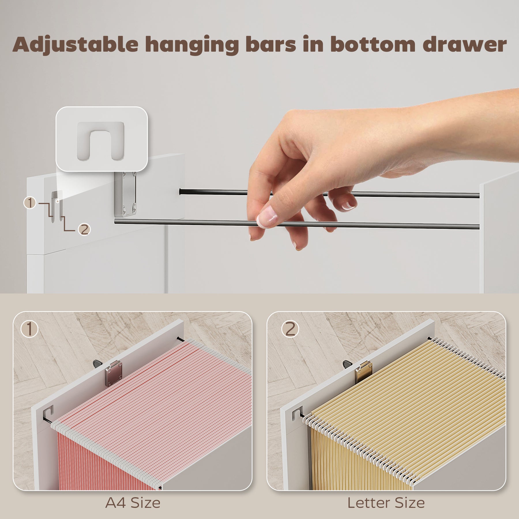 - • Adjustable file rails in larger drawer accommodate various document sizes