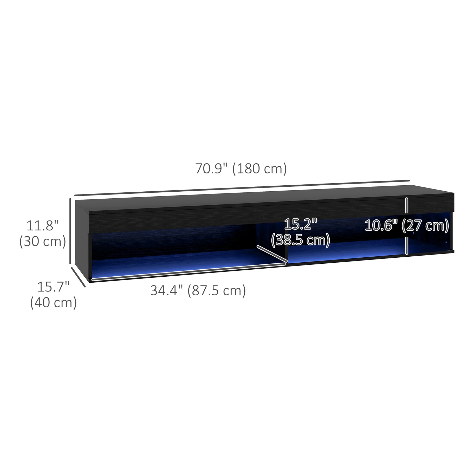 Discover a modern and practical floating TV stand with storage and lights from HOMCOM. Elevate your entertainment zone with its captivating LED lights with 16 colours, 16 brightness levels and 4 lighting modes that create an ambiance like no other. Organize your media devices effortlessly with two compartments. Its floating design maximizes space, making it suitable for compact living areas. Upgrade your home entertainment setup with this HOMCOM media unit.