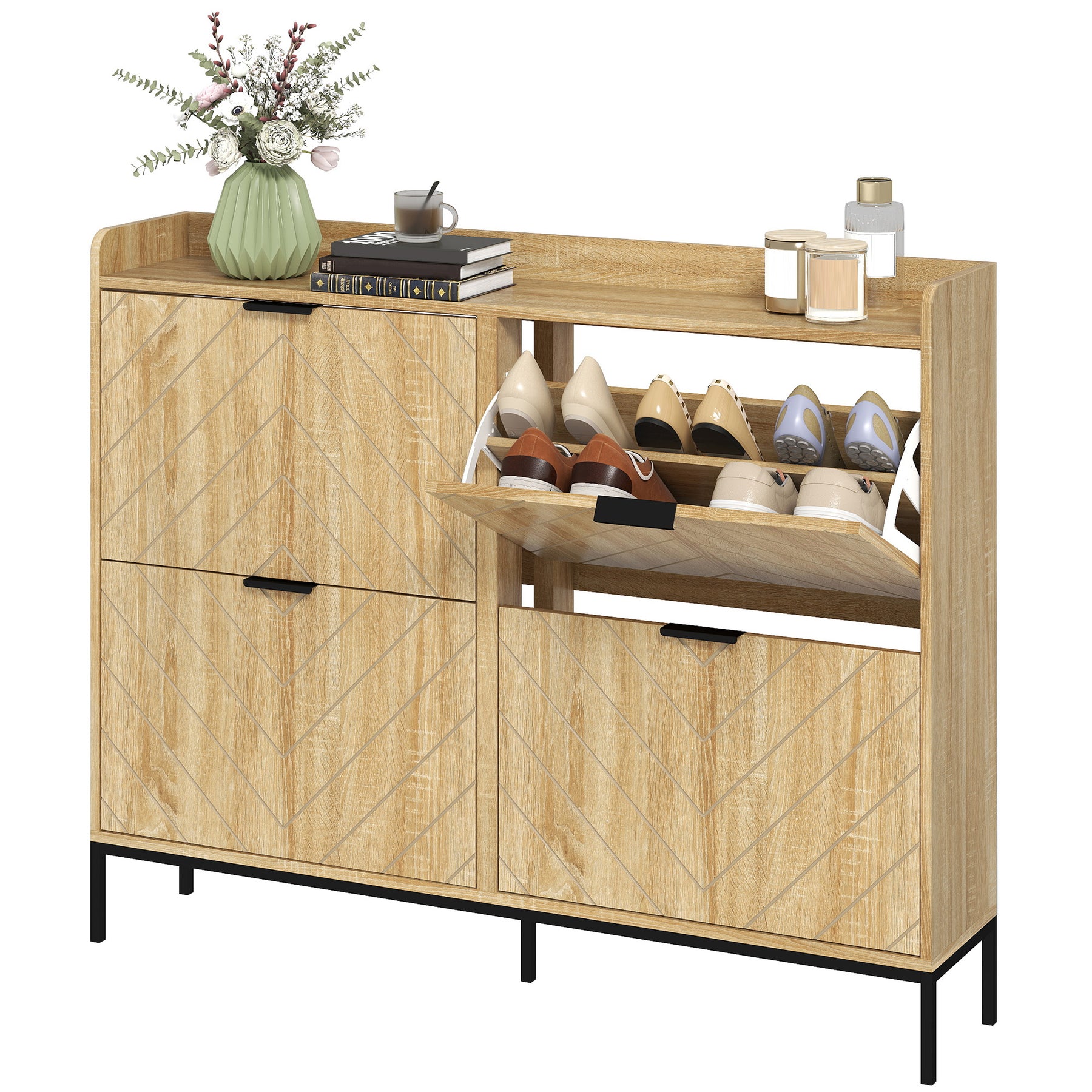 Elevate your entryway with the sleek HOMCOM shoe cabinet, blending style and practicality. This space-saving entryway cabinet features four adjustable flip drawers that accommodate up to 16 pairs of shoes, topped with a raised-edge surface for your accessories. Its slim design is great for snug spaces, and the natural wood grain with chevron patterns adds a contemporary, stylish flair.