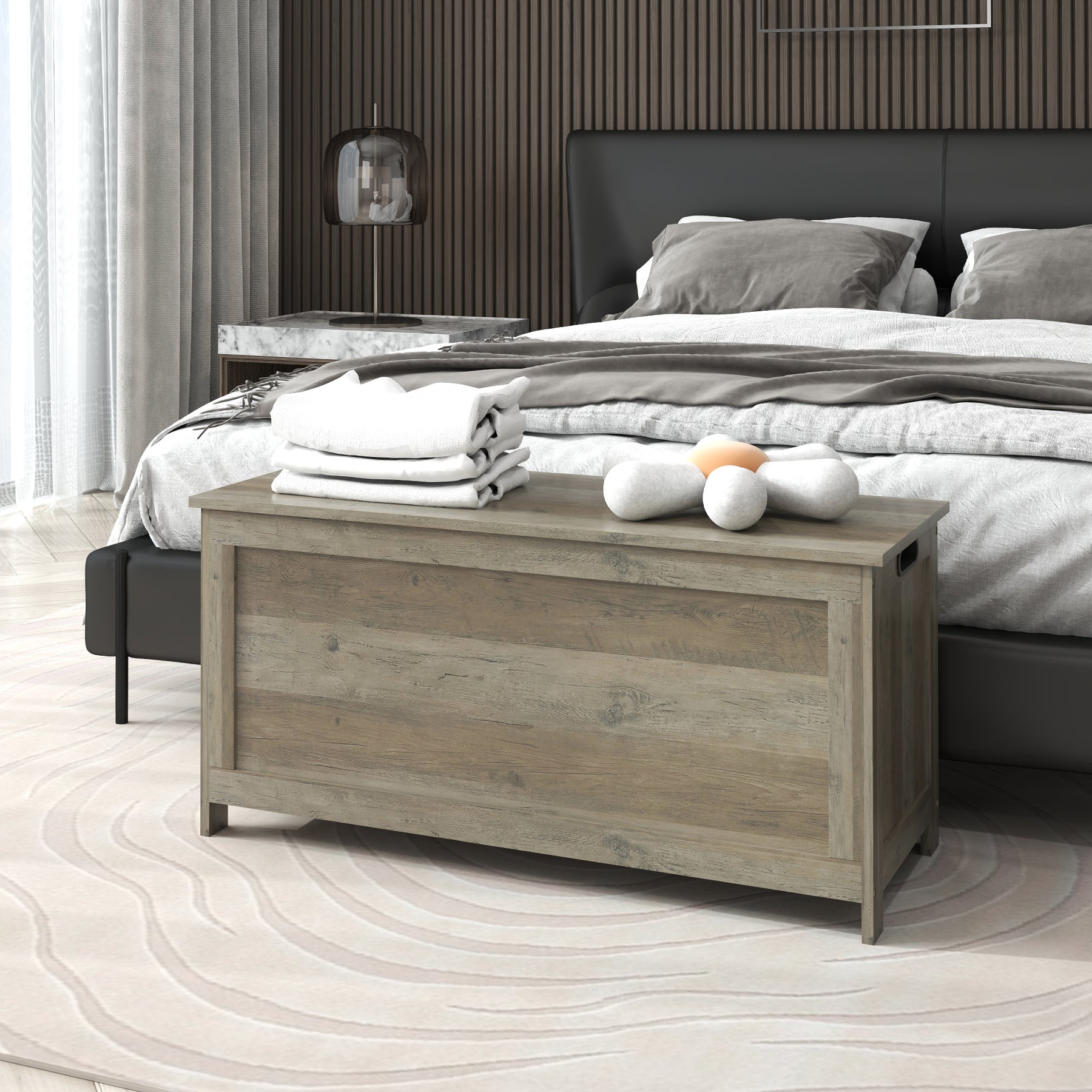 Introducing the HOMCOM modern storage trunk, a great solution for all your storage needs. Whether in your living room, entryway, or office, this versatile storage bench provides ample space for books, blankets, and more. The lid is equipped with two quality hinges, ensuring secure, smooth operation and preventing sudden slamming or the risk of pinched fingers. Simplify your storage with this practical and stylish storage chest.