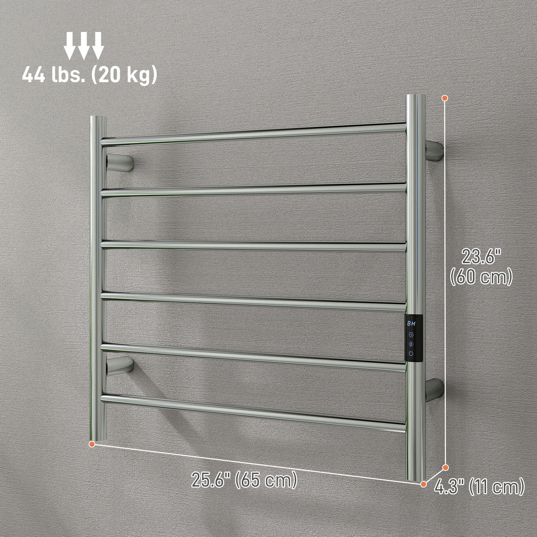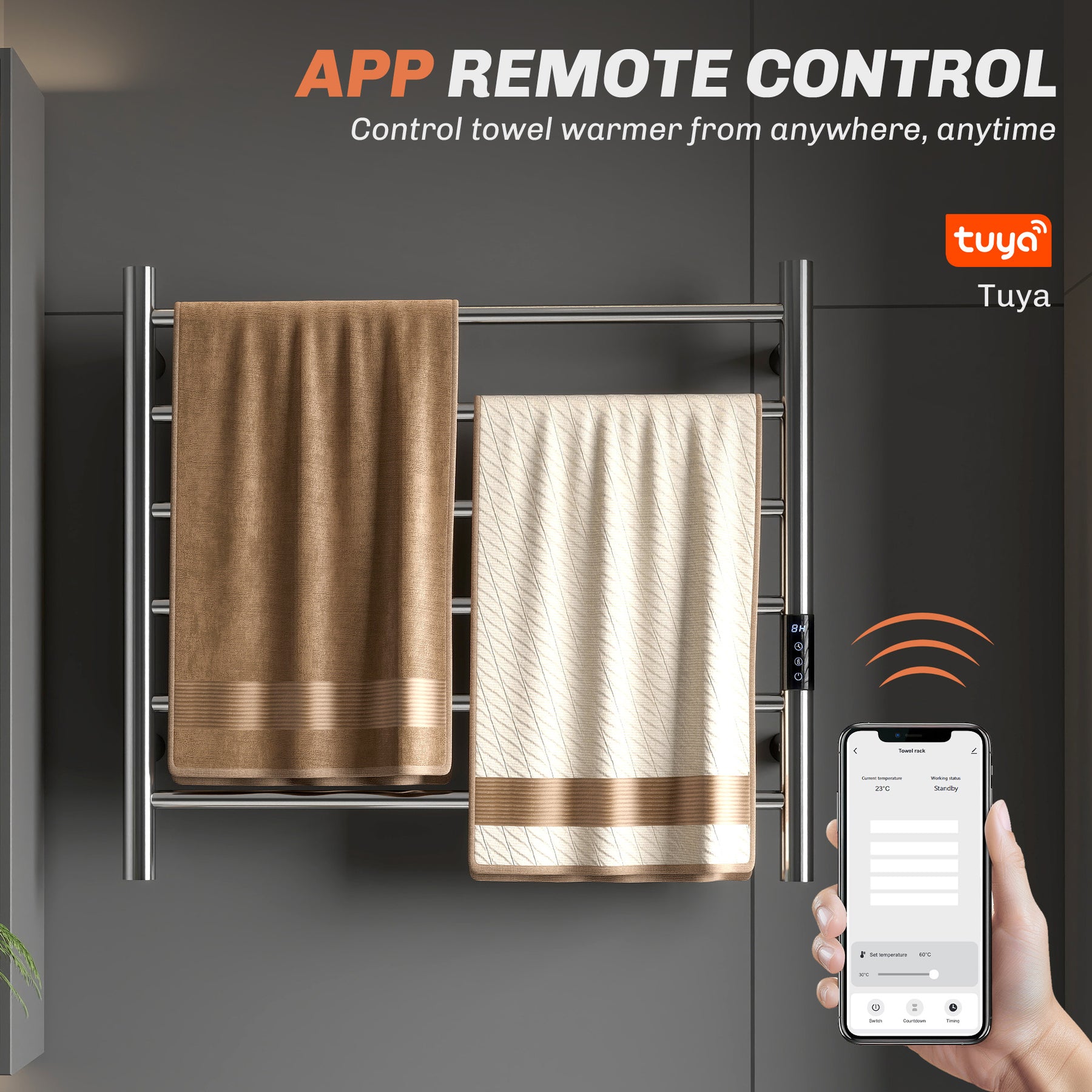Transform your bathroom into a cozy retreat with the HOMCOM towel warmer. Control this smart WIFI-enabled heated towel rack through a touchscreen or the Tuya app, preheating towels and setting a convenient auto shut-off timer. Featuring six bars in a space-saving design, this towel dryer heats up swiftly ensuring your comfort while enhancing energy efficiency.