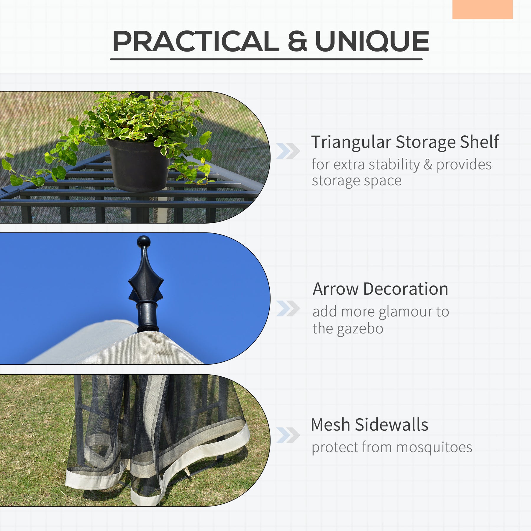 - • Practical double roof gazebo with unique arrow decoration brings more beauty