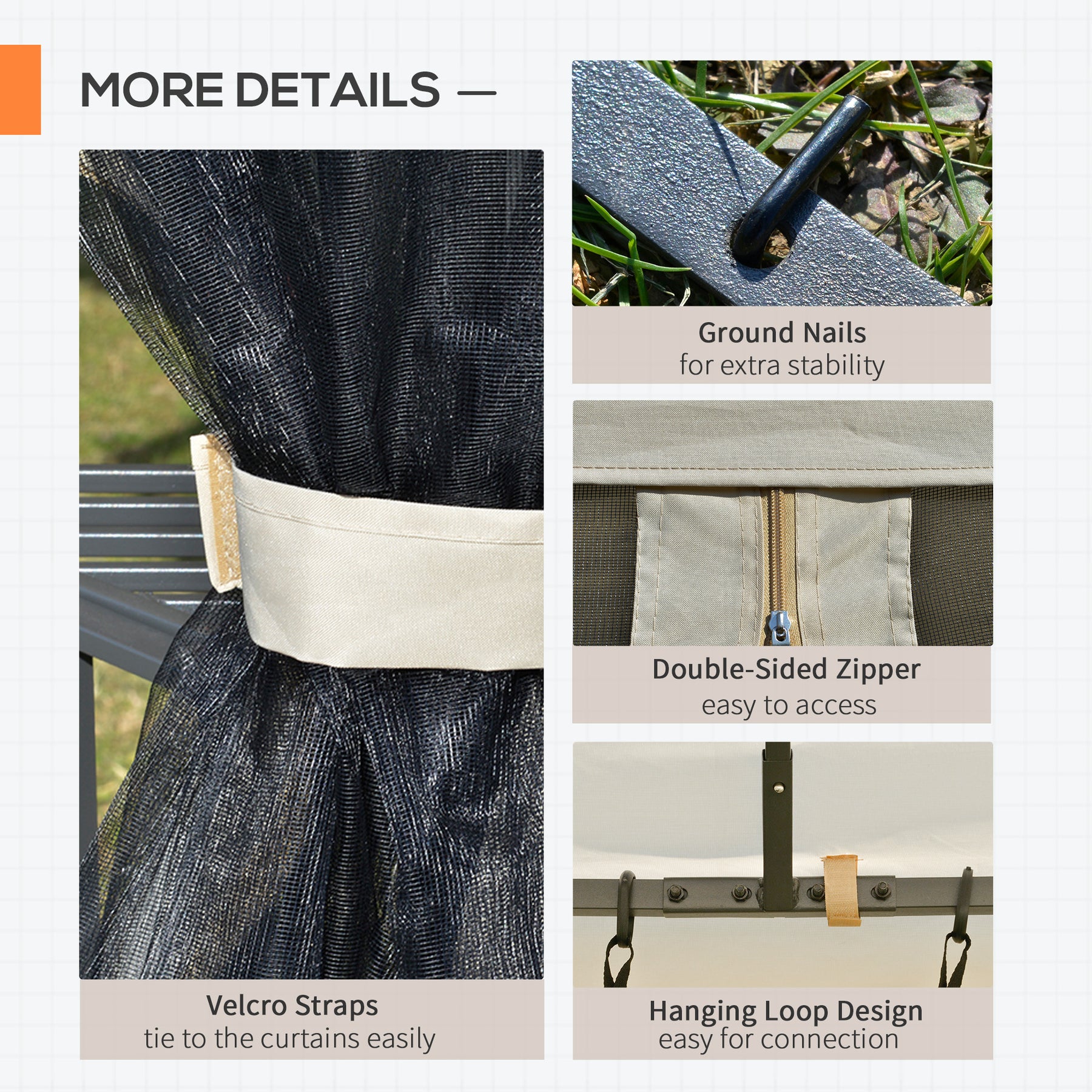 - • Aluminum drainage holes on the gazebo canopy to prevent water accumulation