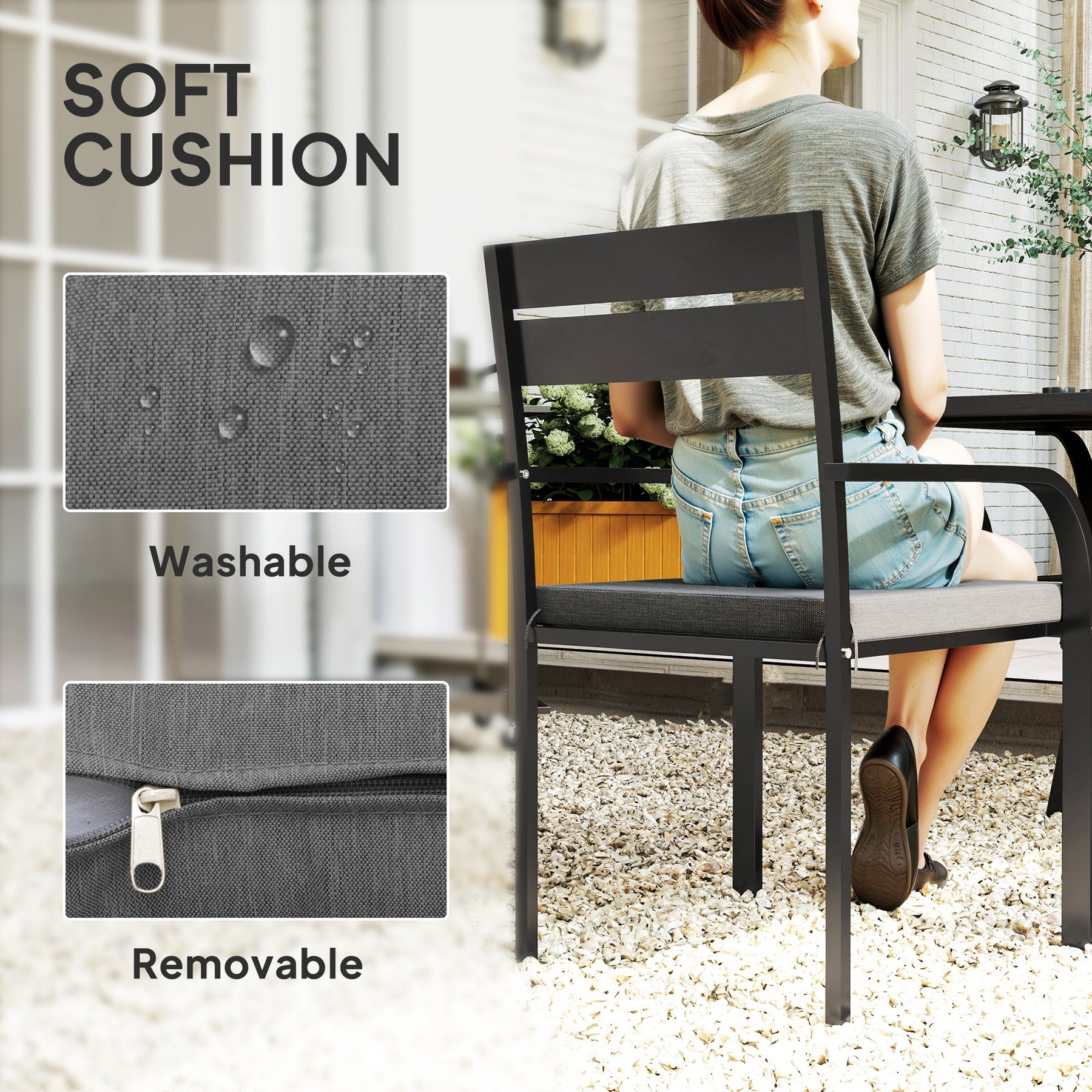 Elevate your outdoor dining experience with the Outsunny garden dining chair set. These chic minimalist patio chairs blend seamlessly with any modern outdoor decor. Stackable for easy storage, they feature plush, washable cushions for comfort. Crafted from rust-resistant aluminum, these chairs ensure a stylish and supportive retreat on your patio or balcony.
