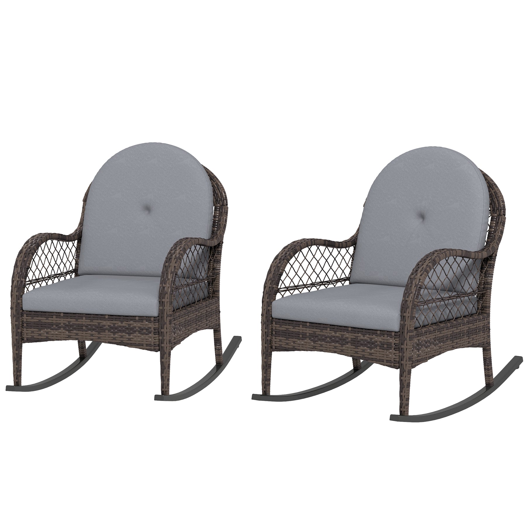 Bring a timeless charm to your indoor and outdoor space with this rocking deck chair set from Outsunny. Plastic rattan showcases natural beauty and outdoor endurance, and a stable steel base with foot pads offers safe rocking. The ergonomic porch chair with inclined back, curved armrests, seat and back cushion means you can rock gently back and forth in comfort, enjoying the great time of the day. Unwind and indulge in the relaxation with rocking lawn chair in porch, balcony, poolside.
