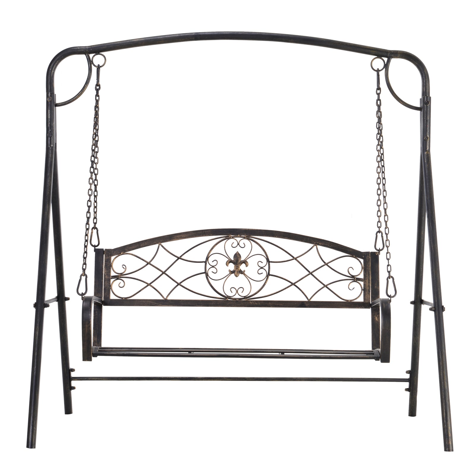 Add elegance to your outdoor space with this Outsunny swing chair. Made of solid steel, it features an 'A' shaped frame and a main swing seat. The slatted two-seater bench prevents water buildup, and the floral-inspired scrolling on the back enhances its charm. A slightly curved seat, high back, and armrests ensure comfort, while four chains securely hold up to 485 lbs. Its antique gold tone finish makes it a standout piece.