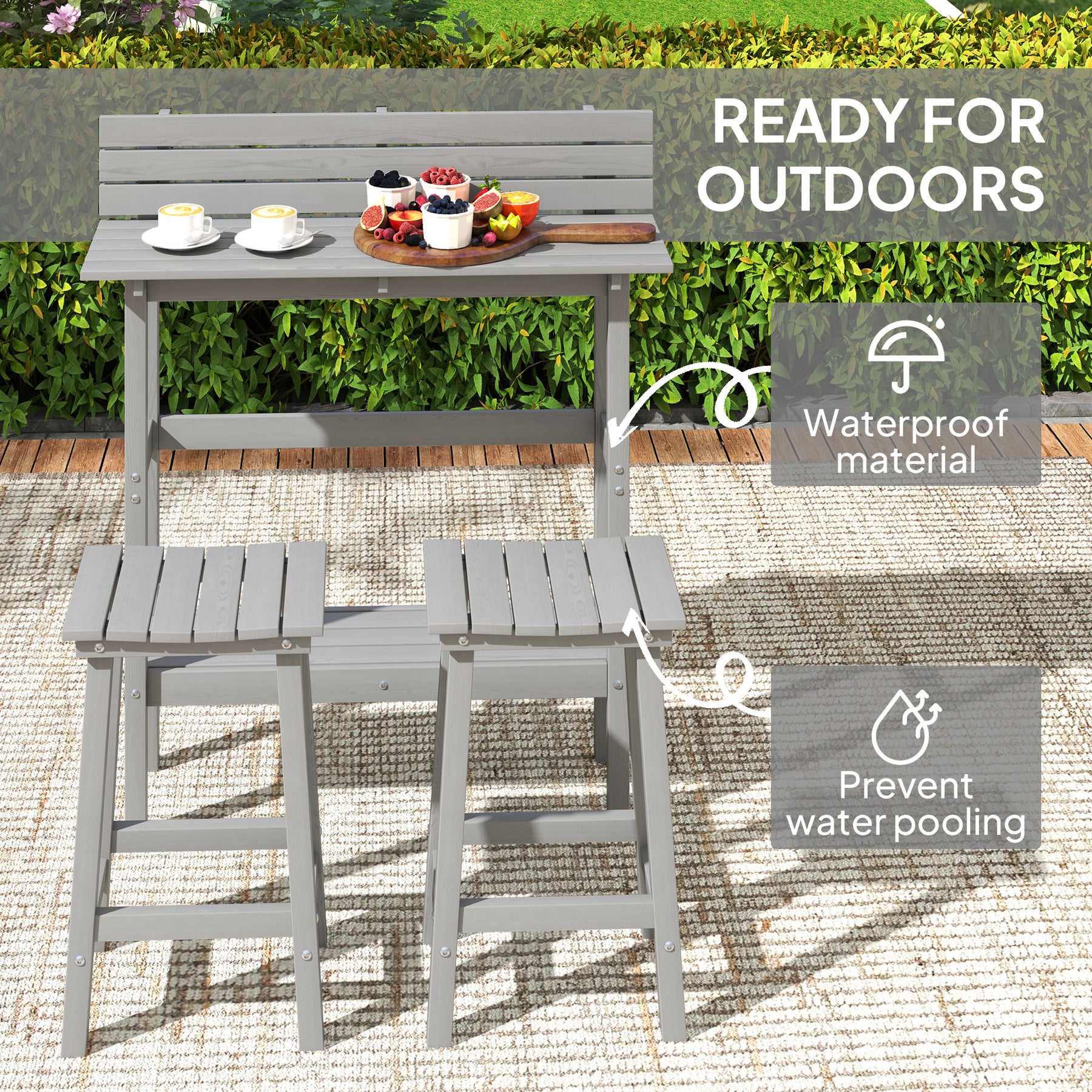 Turn your patio into a cozy getaway with the Outsunny balcony bar set! This charming bistro set includes a counter-height table and two bar stools crafted from HDPE, ensuring longevity and easy maintenance. Featuring a stable back panel, you can relax and enjoy your drinks without a care. Plus, the built-in footrest and comfortable 27.2" (69 cm) height ensure hours of comfort.
