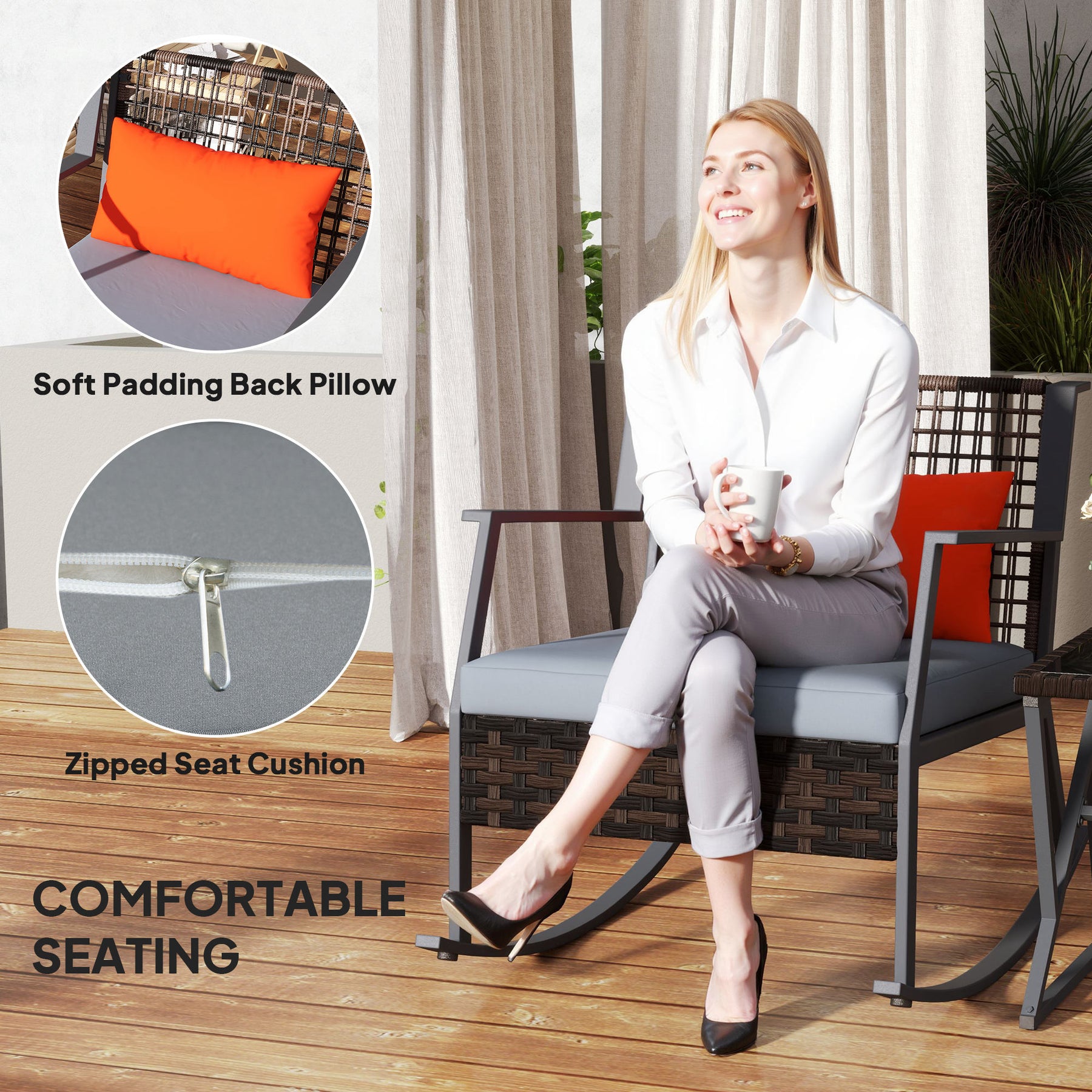 Brighten your outdoor space with the Outsunny wicker patio set - a charming addition for small spaces, whether as a bistro nook or a chic lounge setup. The powder-coated steel frames offer a strong foundation, wrapped in protective all-weather PE wicker for added elegance. The cushioned rocking chairs provide a smooth back-and-forth motion for relaxing comfort.