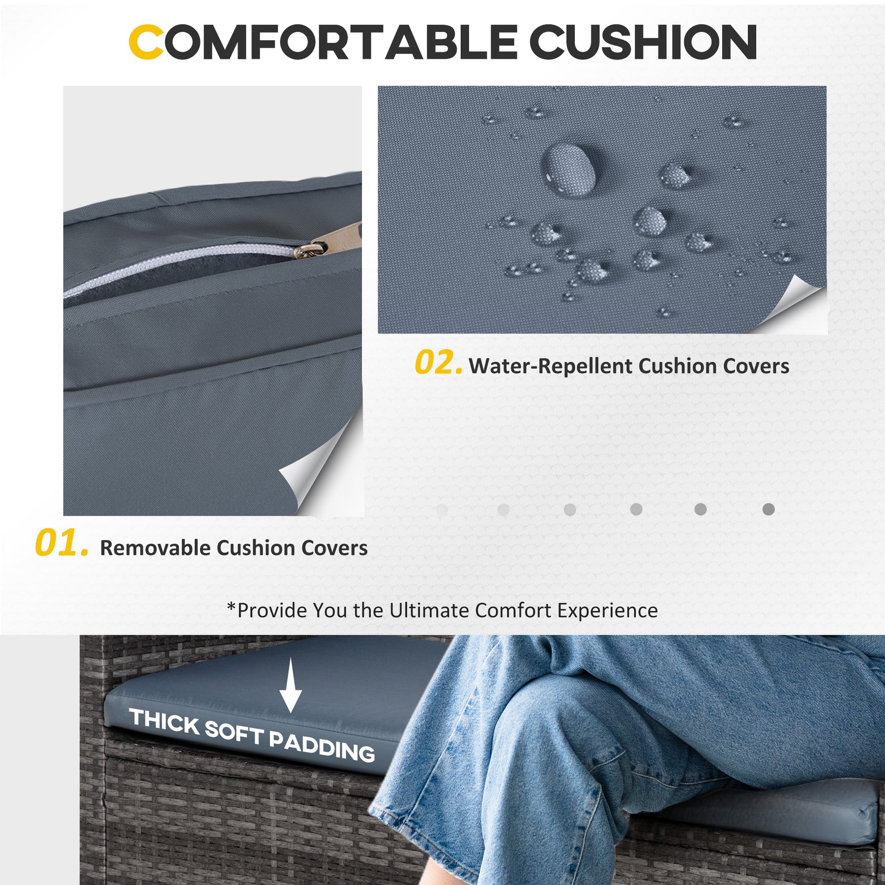 - • Thick seat cushions for comfort