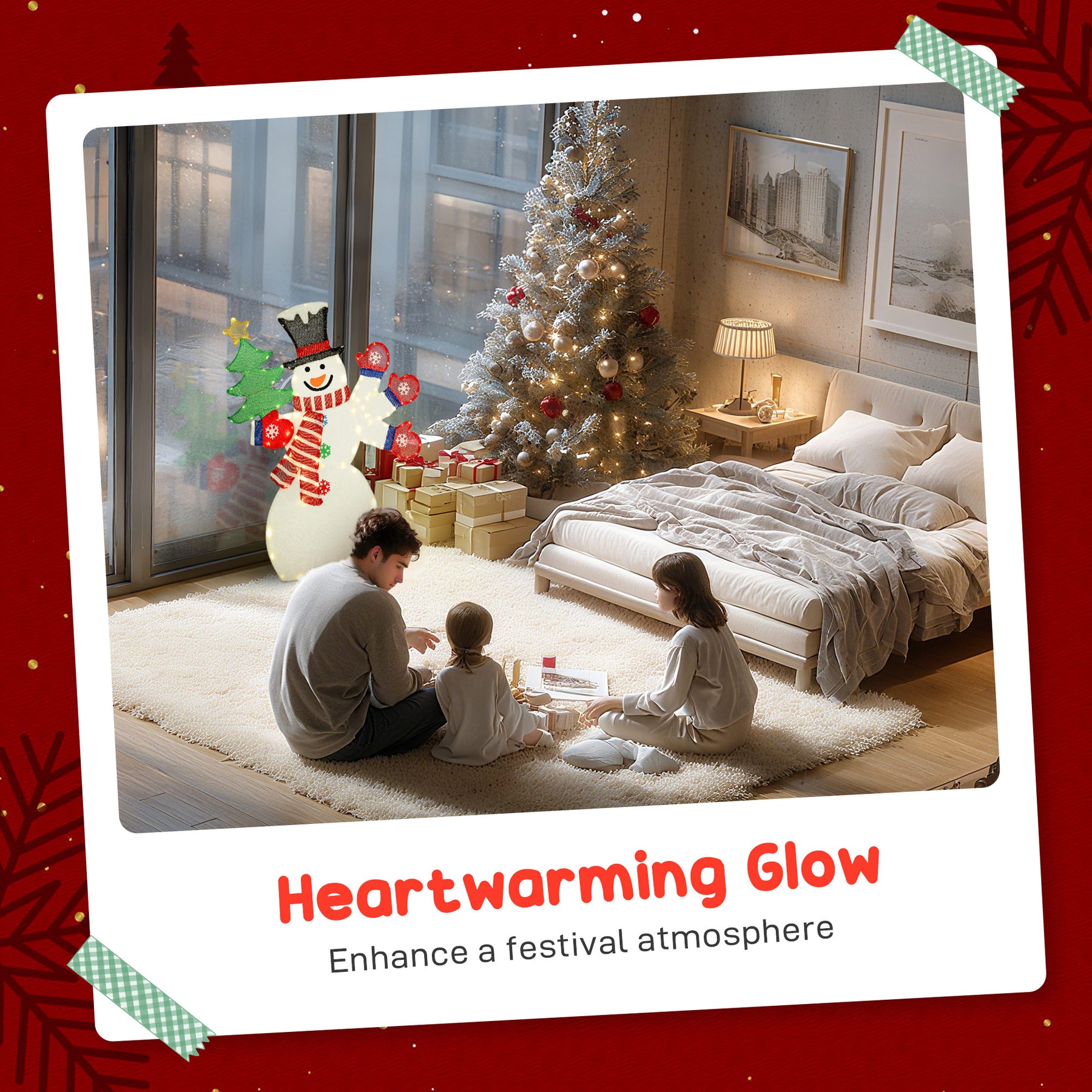 - • Lighted snowman dressed in a scarf, gloves, and a top hat for holiday cheer