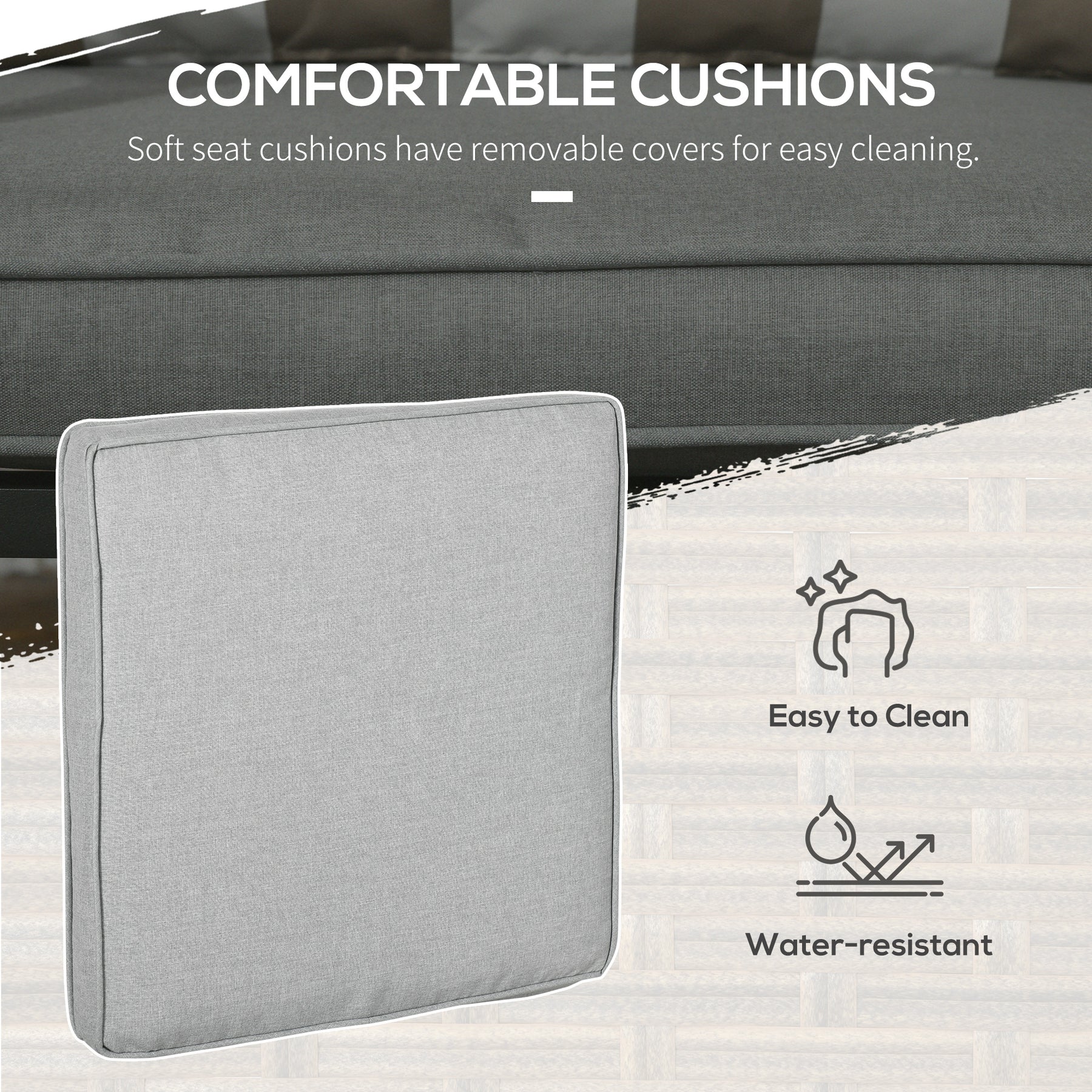 Bring the family and friends together in true, classic style. The outdoor table and chairs from Outsunny will create a beautiful backdrop to all your outdoor gatherings this season. This 5-piece outside chair set comes with a central table, two armchairs and two footstools, all made from powder coated steel frame and wrapped with beautiful PE rattan. Additionally, the table is with a metal tabletop and a shelf to serve your outdoor dining needs. Enjoy outdoor time with family and friends.