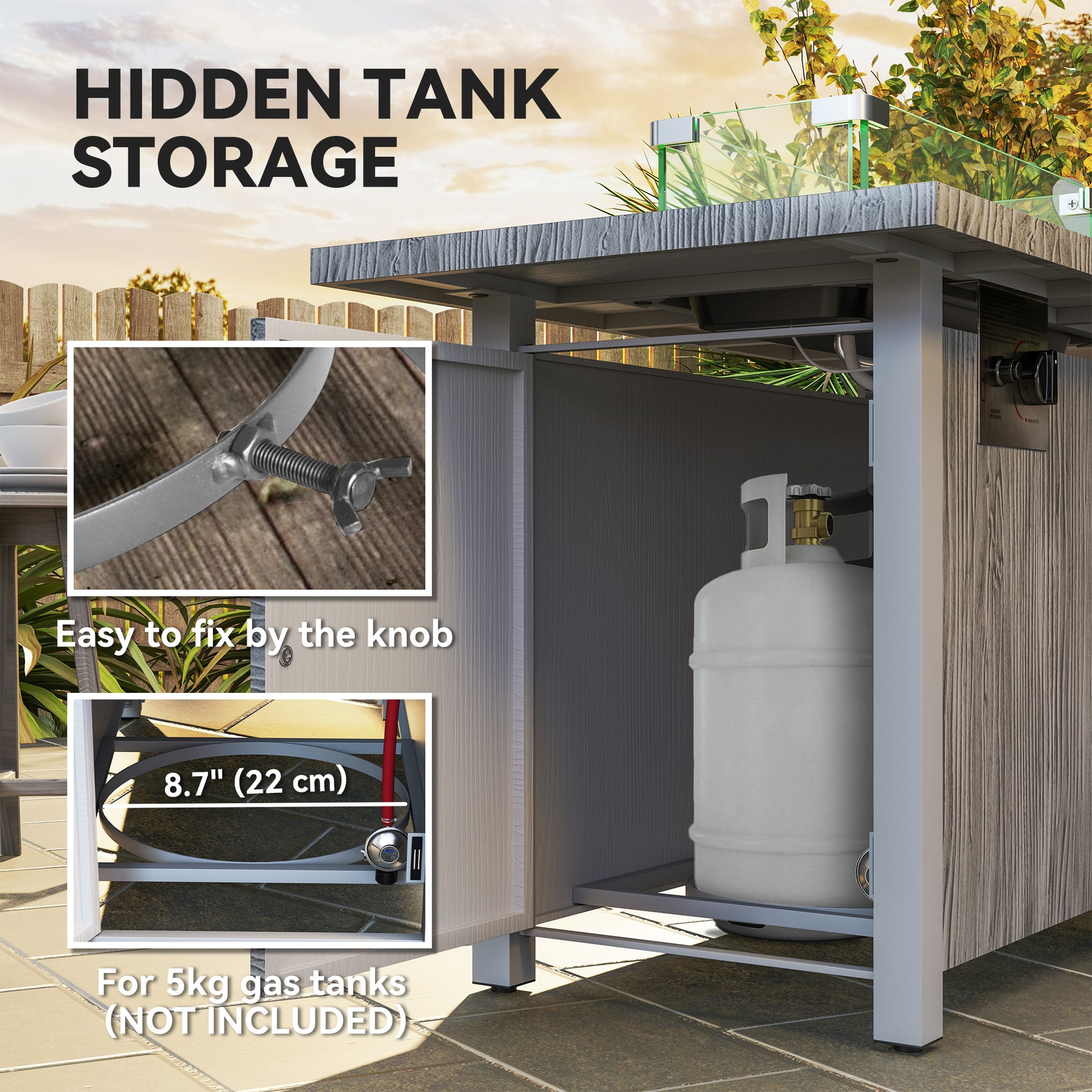 - • 50,000 BTU burner, gas tank not included. Magnetic door on tank compartment