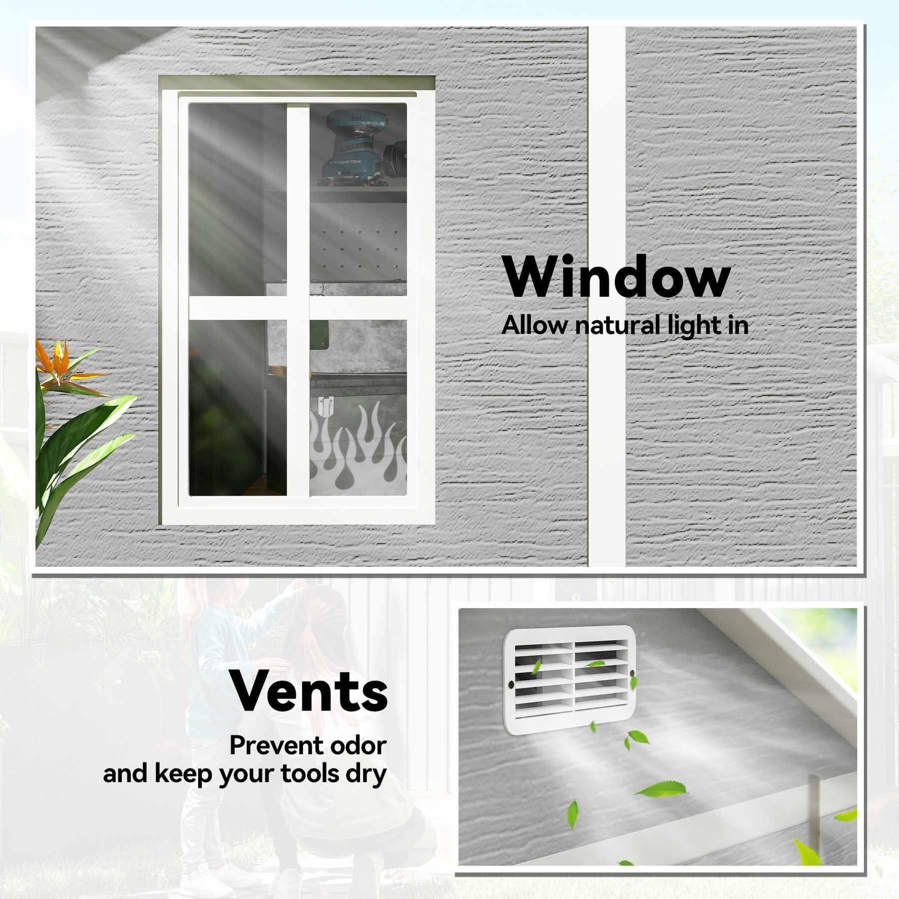 Discover the spacious Outsunny Shed, a haven for your garden tools and outdoor essentials. Crafted from 12mm thick polypropylene resin and reinforced with aluminium, it's waterproof, UV-resistant and stylishly designed to withstand the elements. The included floor keeps rainwater at bay, while a clear window and dual vents ensure your resin shed is always bright and airy.