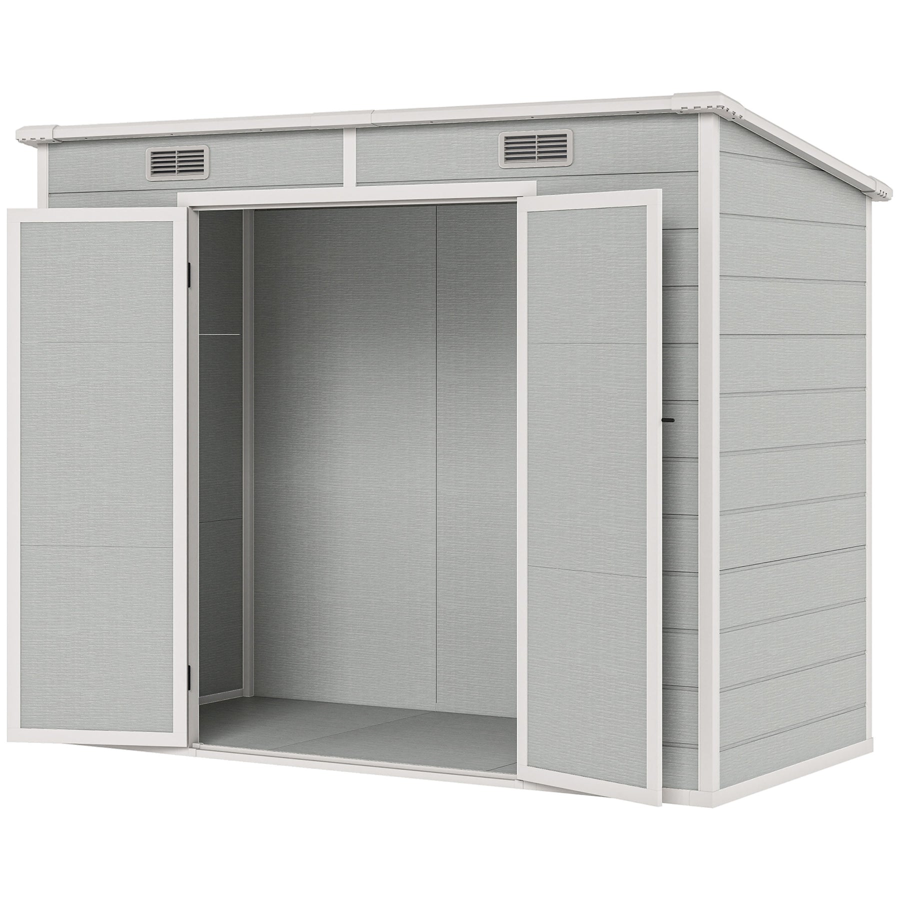 Discover the spacious Outsunny Shed, your new haven for outdoor organization! Crafted from robust 12mm thick polypropylene resin and reinforced with aluminum, this waterproof, UV-resistant resin shed keeps your tools secure and dry. The included floor shields against rain, while a sunlit window and dual vents maintain freshness. Great as a outdoor garden tool shed!