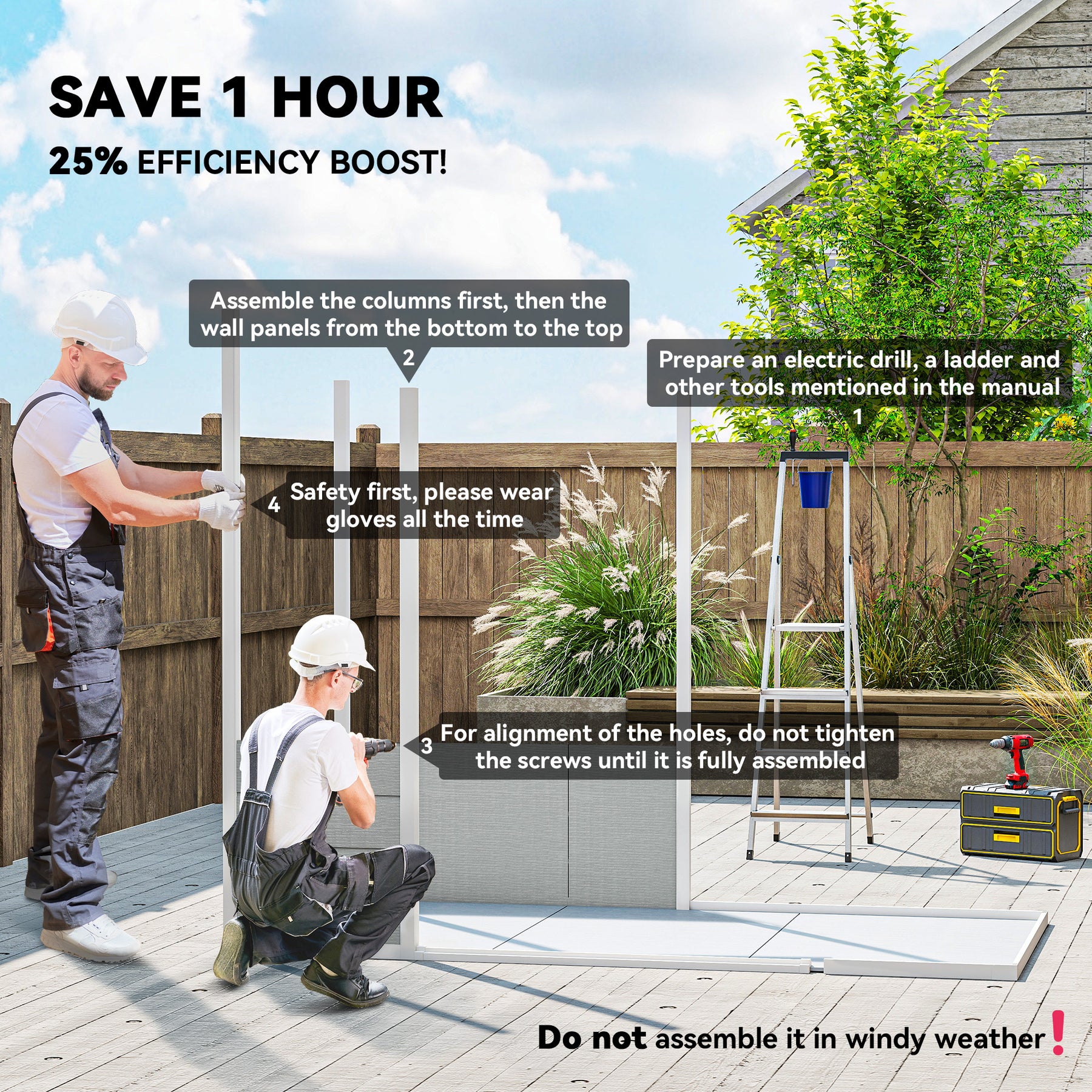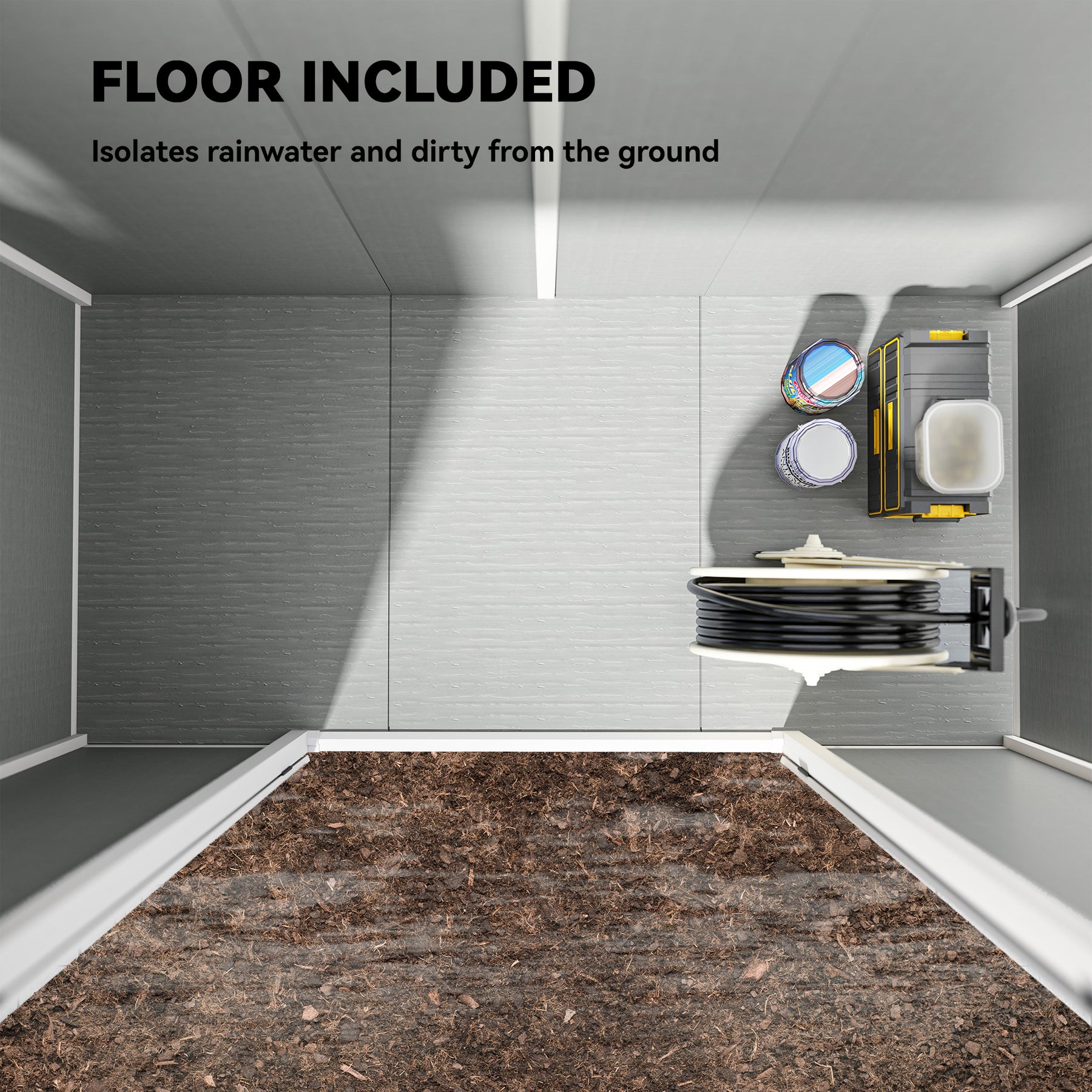 - • Spacious outdoor storage shed with floor accommodates extensive garden tools