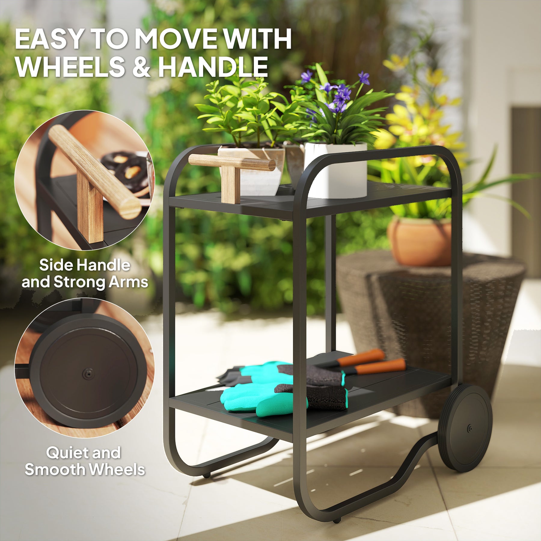 Elevate your hosting experience with the Outsunny two-tier bar cart! Crafted with a robust steel frame and finished with a sleek powder coating, it's great as both an outdoor bar cart and a coffee cart. Featuring two wheels and solid side arms, it's designed for easy mobility, adding a touch of style to any gathering, indoors or outdoors. Whether serving drinks or snacks, this cart makes entertaining effortless and enjoyable.