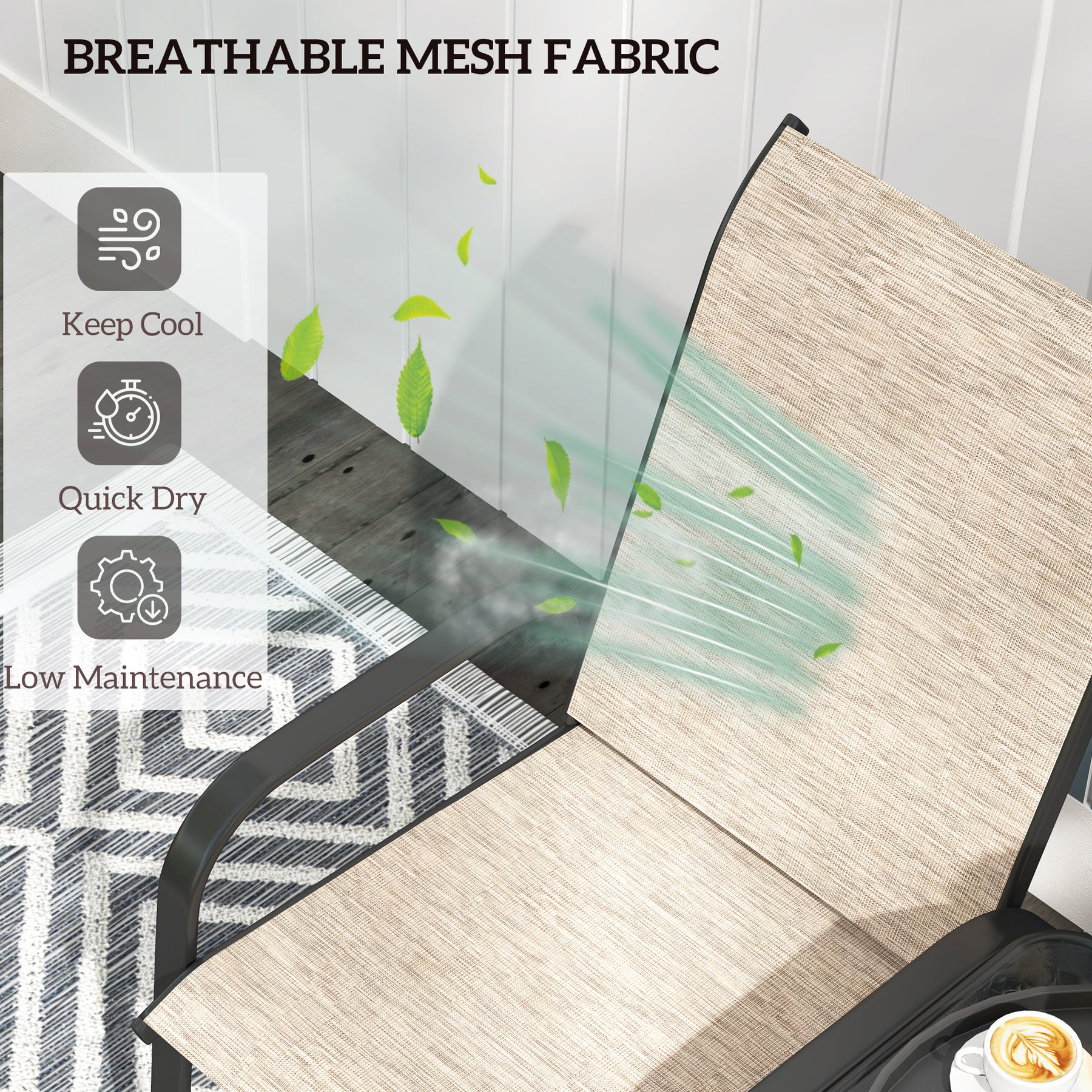 Enjoy warm weather with a friend using the Outsunny outdoor bench, combining two seats and a table. The park bench is made from a robust powder coated steel frame. Enjoy the cool comfort of breathable mesh fabric on the chair. The middle table features a water ripple glass top. Sit back on the curved armrests and relax into the supportive steel frame of your new favorite garden bench.