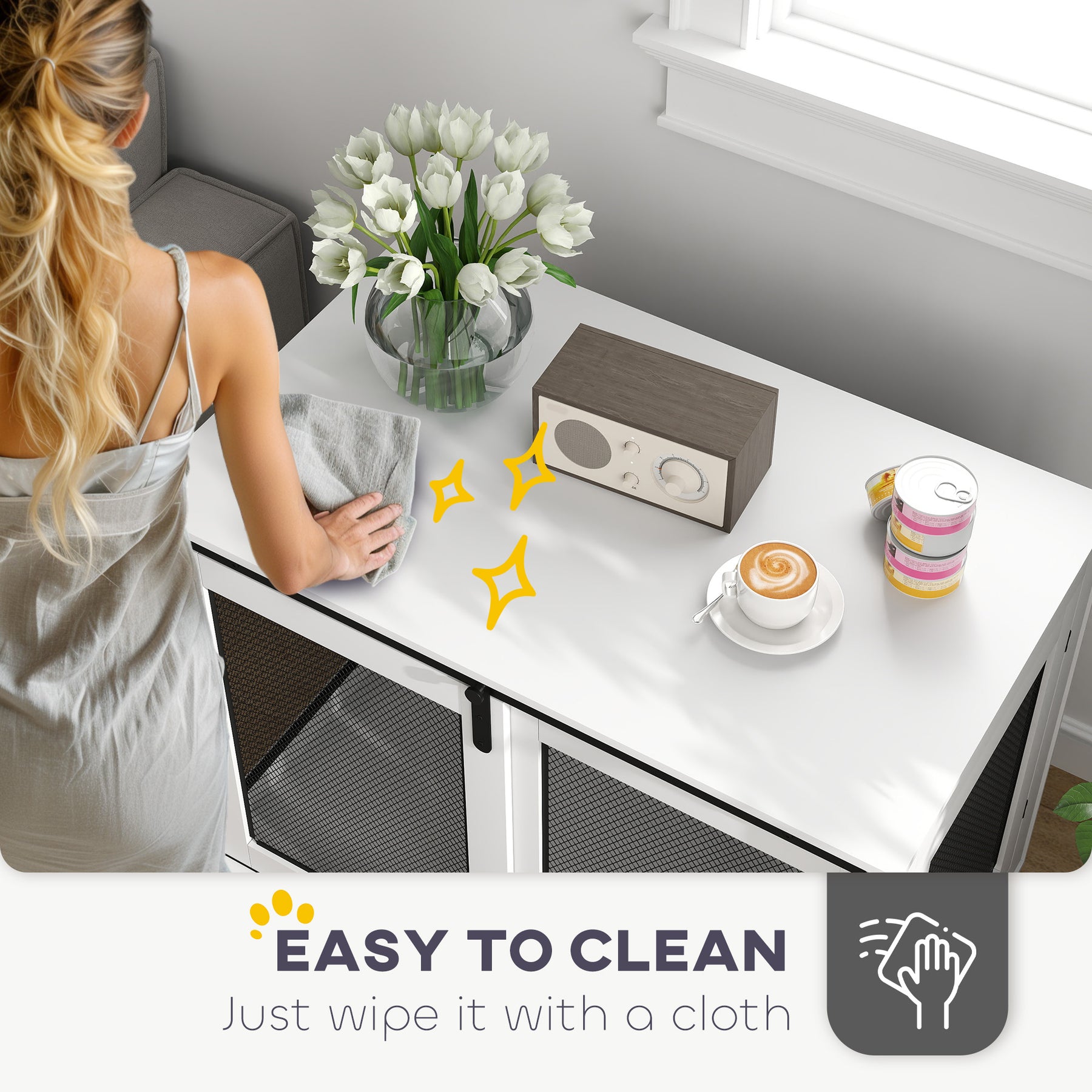 Discover the versatile PawHut large dog kennel furniture, where functionality meets style! Use it as a cosy dog crate or a chic side table; its particleboard and fine mesh grid design keep your furry friend from chewing. Boasting a dual-door setup, including a stylish barn door, this piece ensures comfort with a three-sided ventilation system and spacious interior for large dogs.