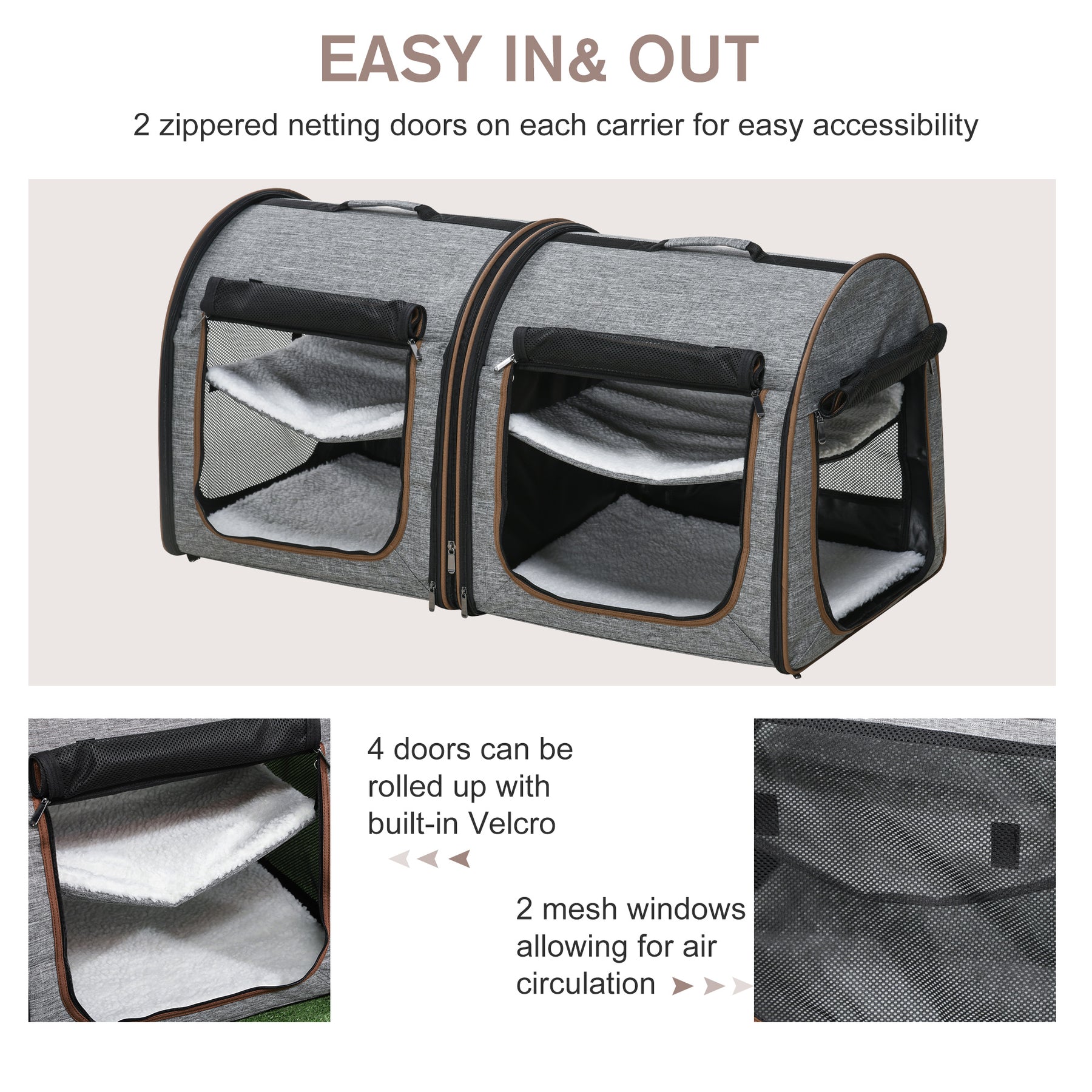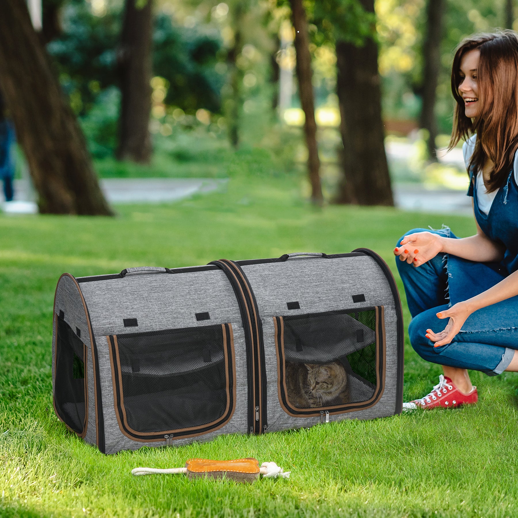 This soft-sided double enclosure cat carrier for 2 cats from PawHut can be used as a large enclosure or easily divided into two smaller areas. Each enclosure space features a large mesh screen for visibility and ventilation. Light, portable, and easy to carry, this collapsible pet travel carrier is complete with carrying strap and handle for added safety for using as a pet booster seat.