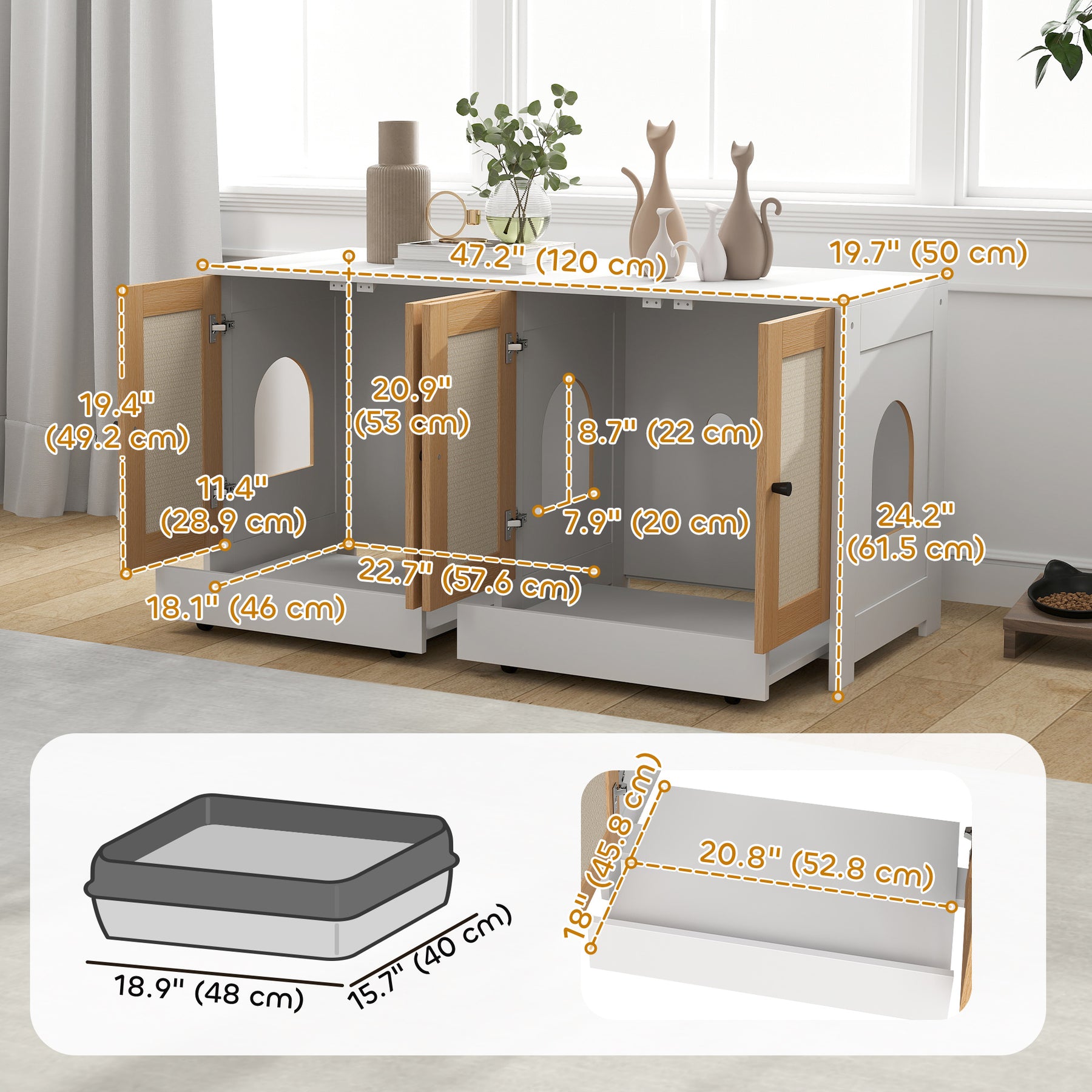 Transform your cat's routine with the PawHut cat litter box enclosure! This clever design offers a divided interior for multi-cat use, complete with scratch mat on the door, and entry holes for easy access. Doubling as chic furniture, it blends seamlessly into your home decor, keeping the litter box hidden and your space stylish.