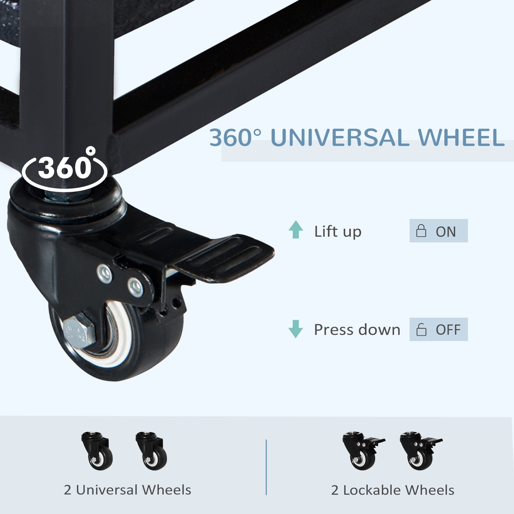- • Four caster wheels for easy movement, two have brake to prevent unintended movement