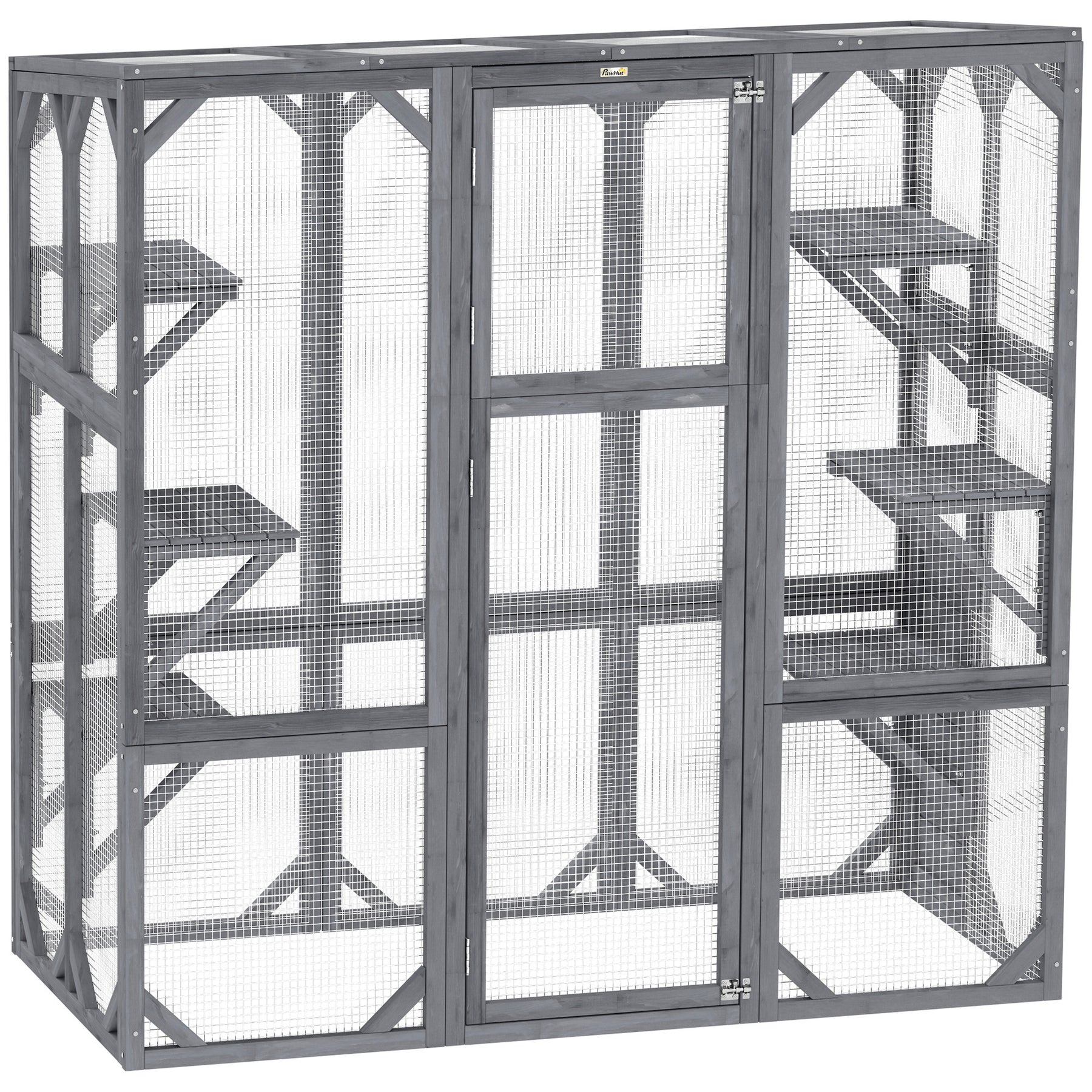 Discover the joys of the great outdoors safely with the PawHut catio! The back panel can be DIY, connects to different spaces, and even has a small door hole for added adventure. Its sun panel and titled roof ensure your furry friends stay cool and comfy. Suitable for up to 3 cats to explore the 6 jumping platforms in this spacious outside cat house.