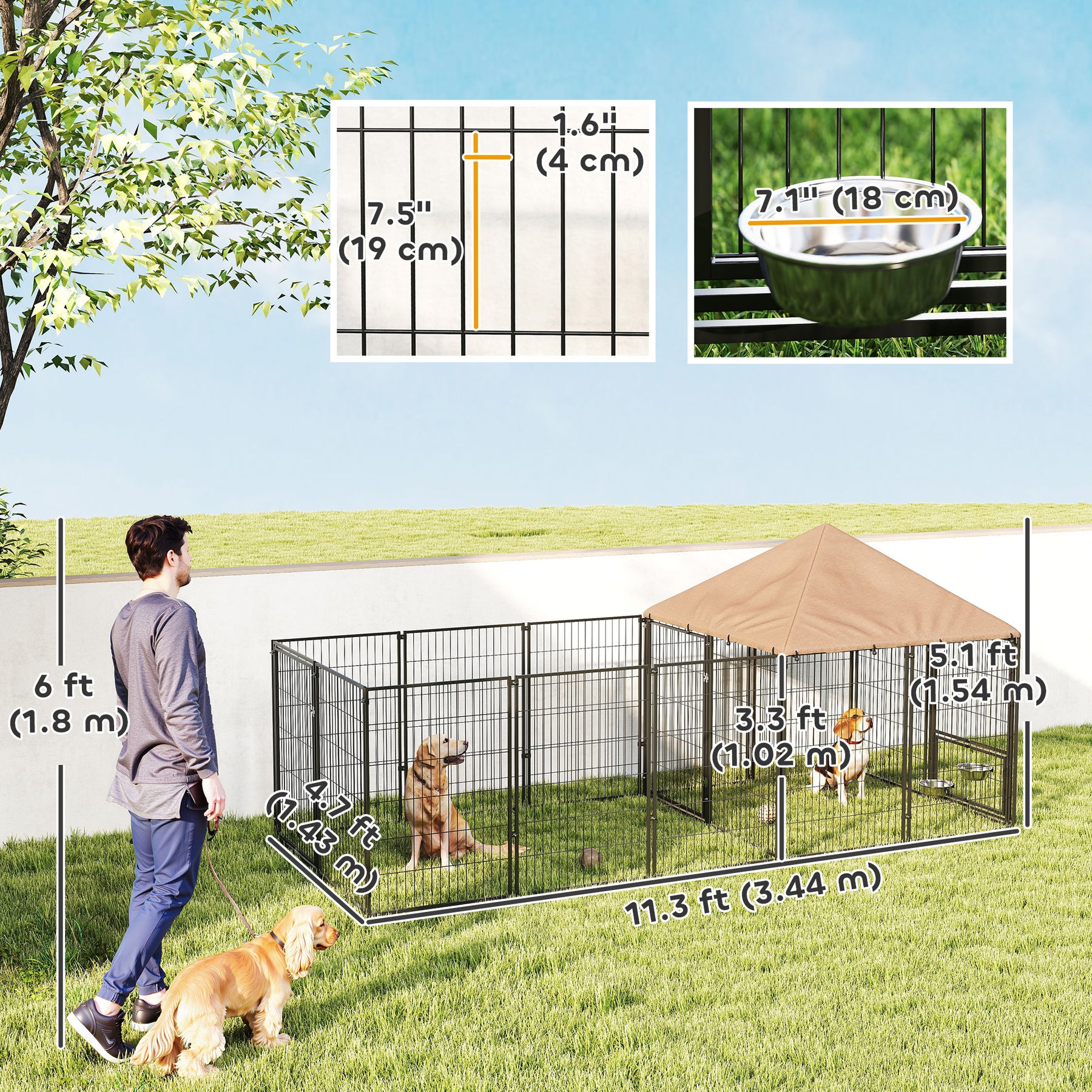 Experience the outdoor retreat for your furry companion with the PawHut Outdoor Dog Kennel! Featuring private rooms and a spacious activity area, this kennel provides a balance of playtime and privacy. The plastic-coated Oxford fabric roof offers reliable protection from sun and rain, ensuring year-round comfort. The innovative 360° rotating bowl rack makes feeding and hydration effortless.