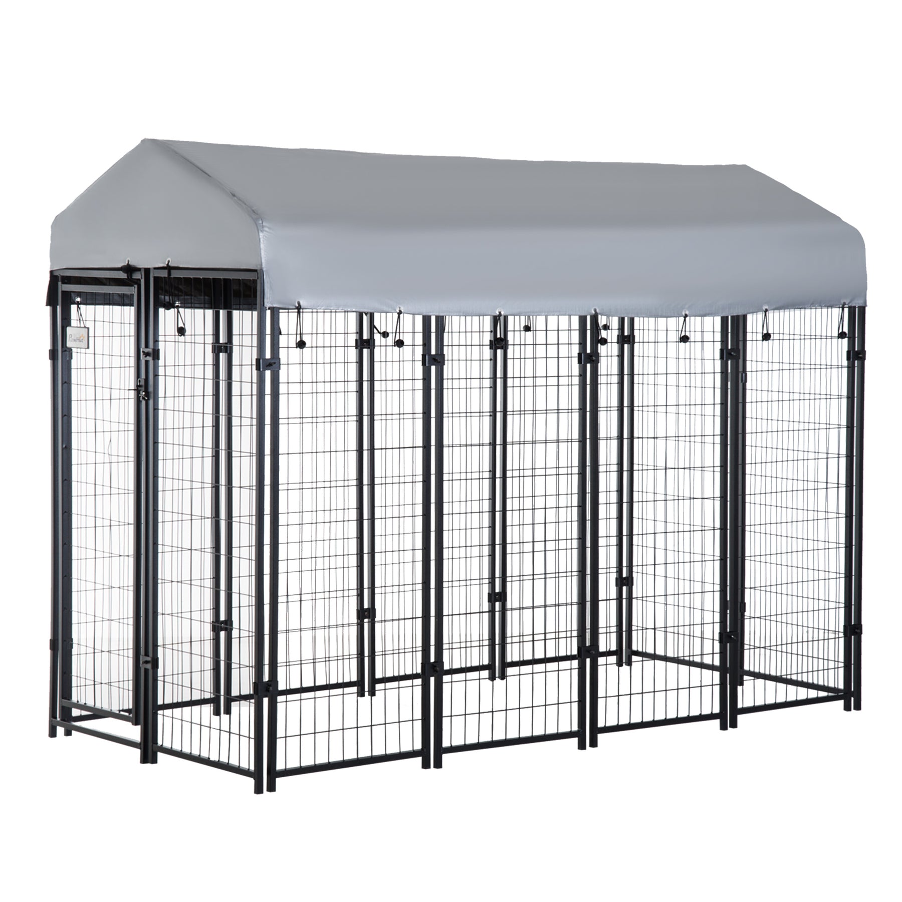 This metal dog kennel with a covered roof from PawHut has everything you need. A tough metal frame ensures years of use with little to no necessary maintenance. A stable roof helps keep your pets protected from the weather and outside elements. Increased sun protection prevents ripping, cracking, fading, or peeling. The pitched roof of the pet cage allows water, debris, and light snow to easily run off. The raised legs make the playpen easy to hose or sweep to prevent dirt build up.