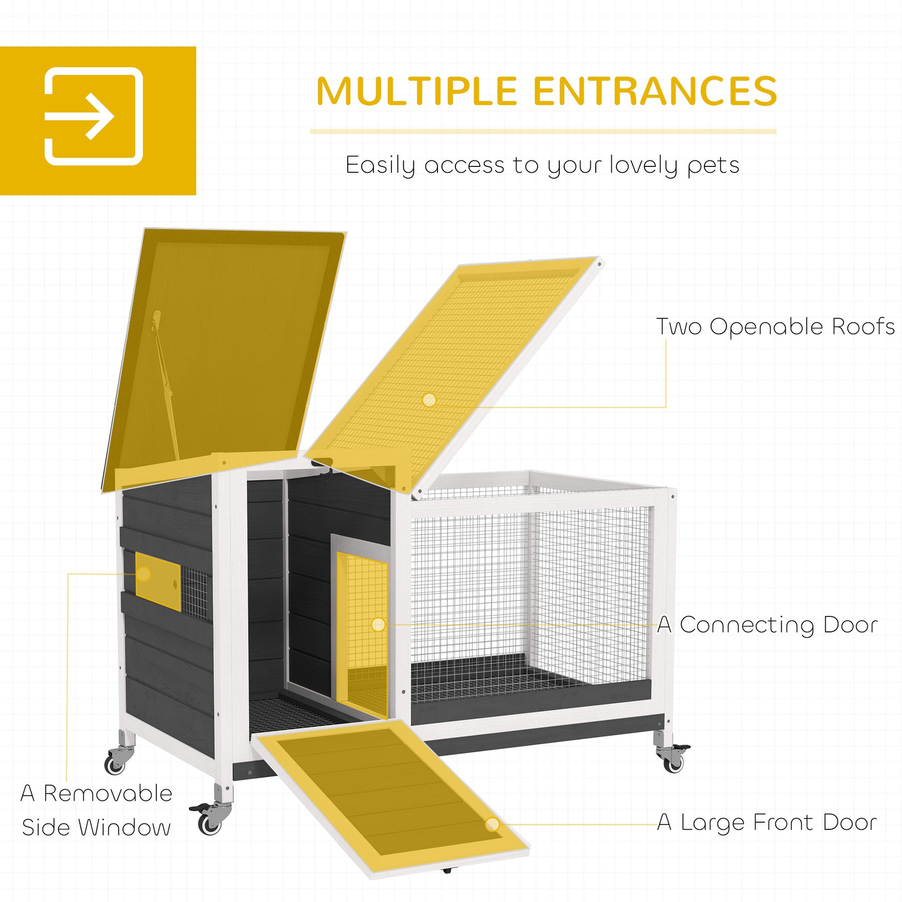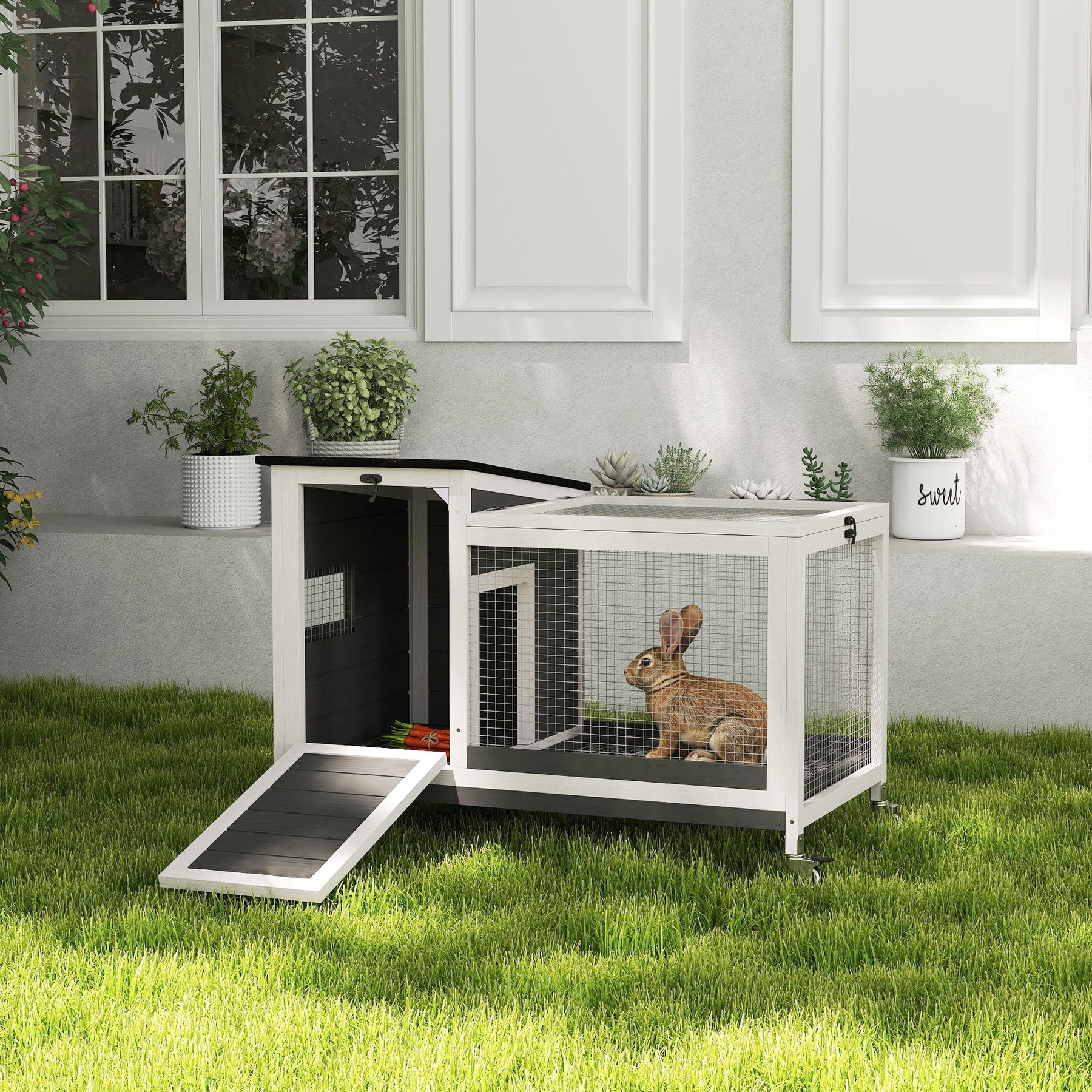 Keep your bunnies happy and healthy with the PawHut Rabbit House! Its thoughtful design features a pull-out tray and bottom wire floor for hassle-free cleaning, while smooth casters let you quickly move it. Multiple access points and a weather-resistant roof keep your fluffy companions comfortable in any weather.