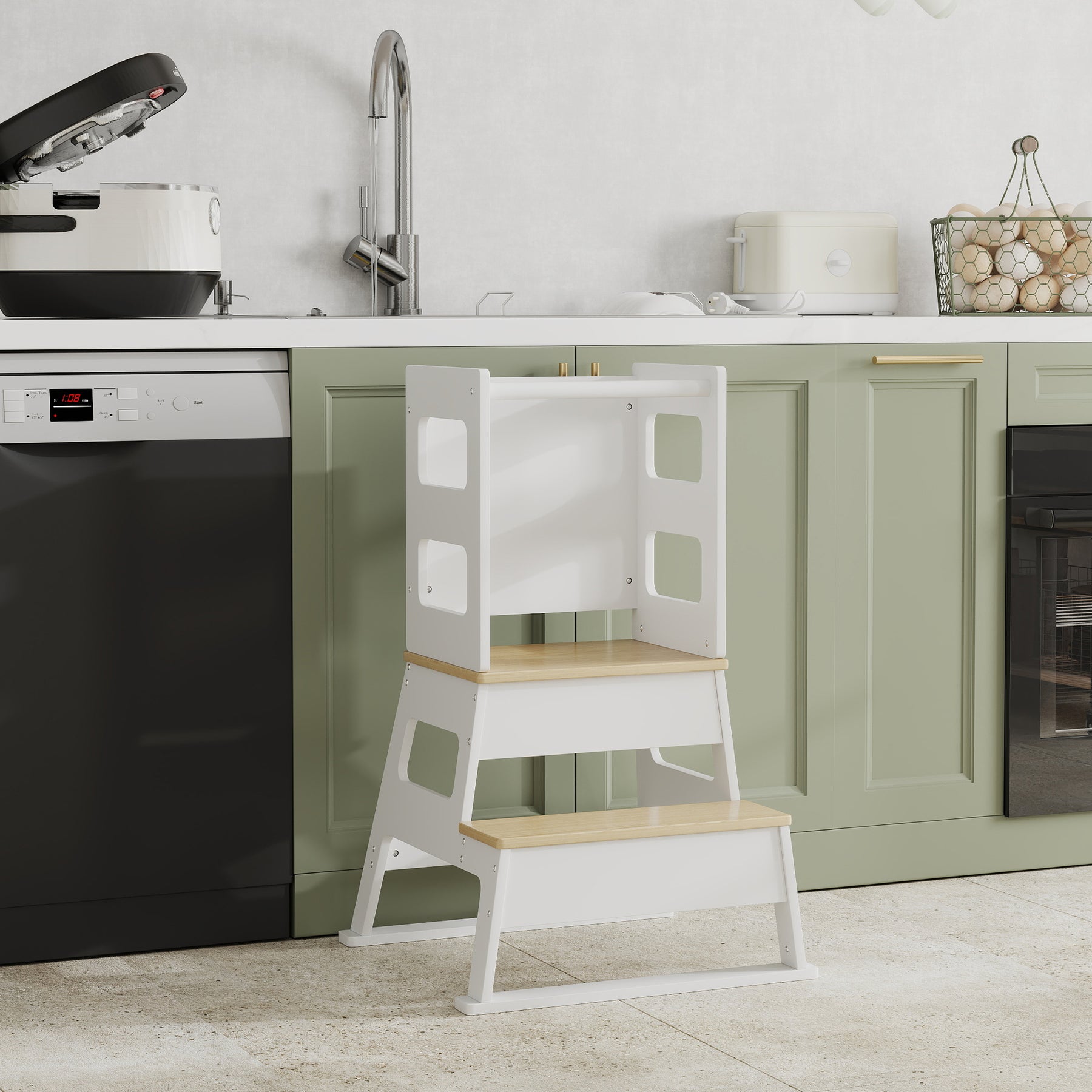 Discover the joy of independence with the Qaba Toddler Kitchen Helper! Suitable for brushing teeth or helping in the kitchen, this toddler step stool features a handy blackboard and a safe, trapezoidal structure with safety rail. Crafted from smooth MDF and pine wood, it's the go-to stool for every growing adventurer.