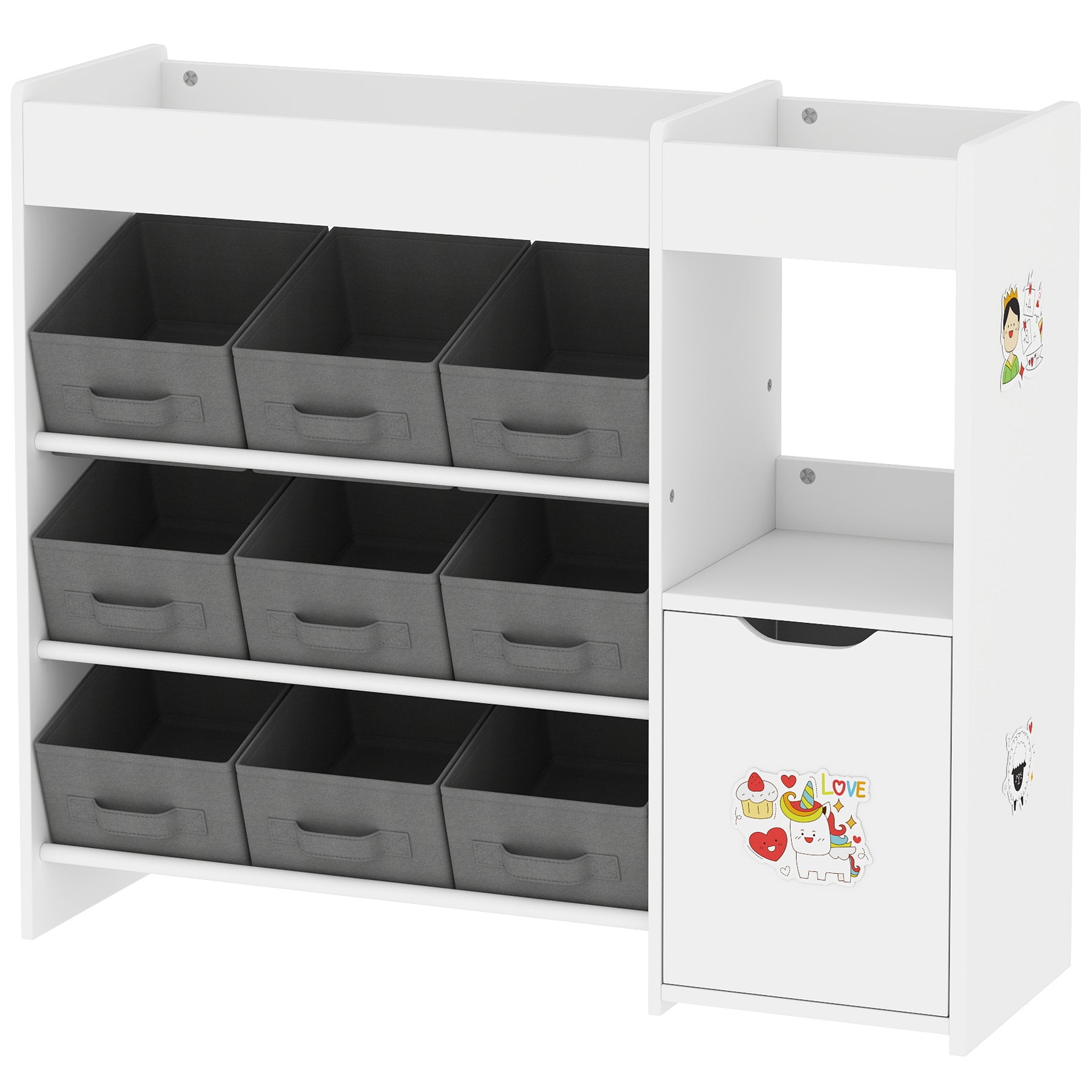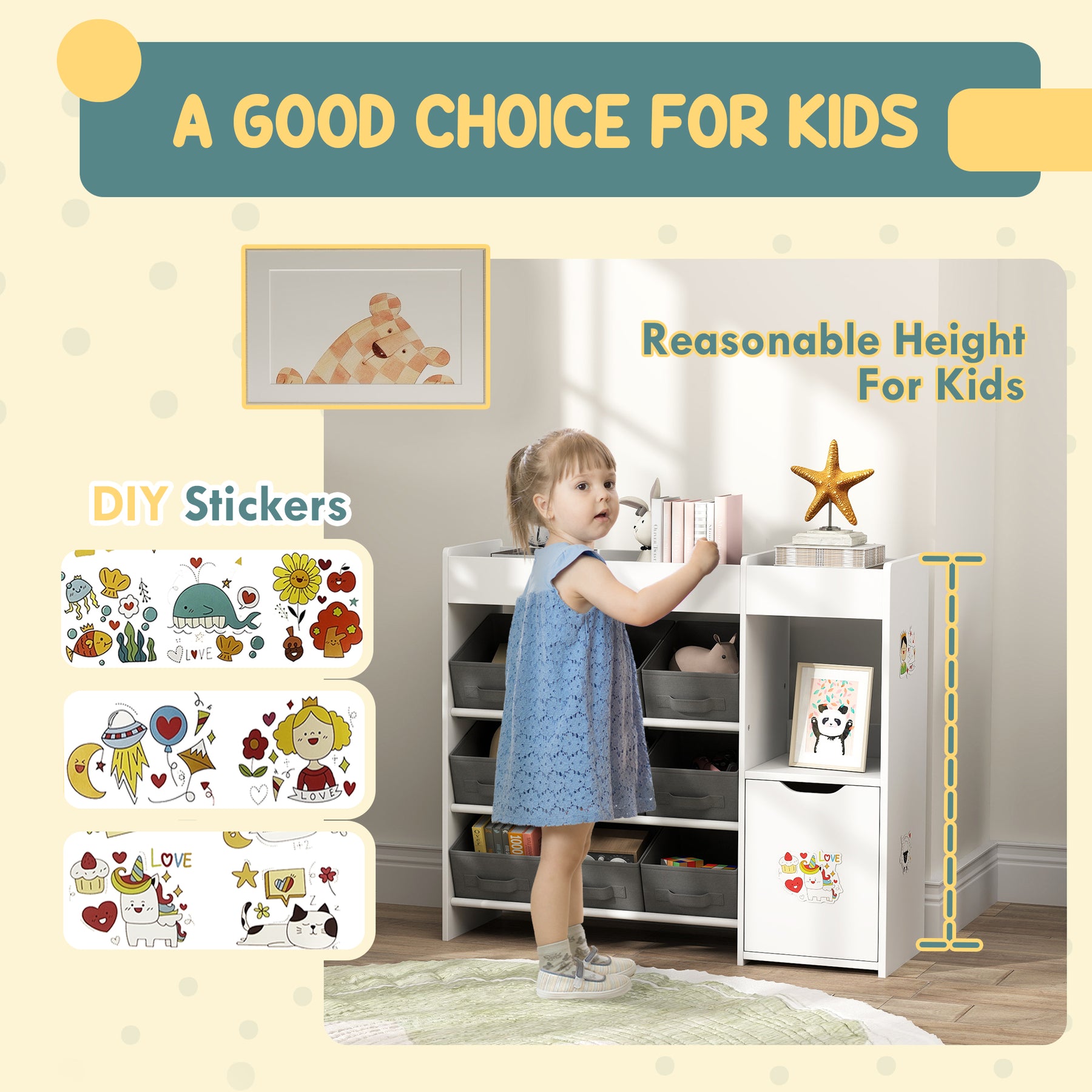 Discover the magic of tidiness with the Qaba Kids Shelf! This 4-tier wonder comes with 9 storage boxes and additional shelves, including a cabinet and open space atop for easy access. Rounded, safe edges and cheerful DIY stickers make it a joy for kids to organize toys, books, and clothes, transforming cleanup into playtime!