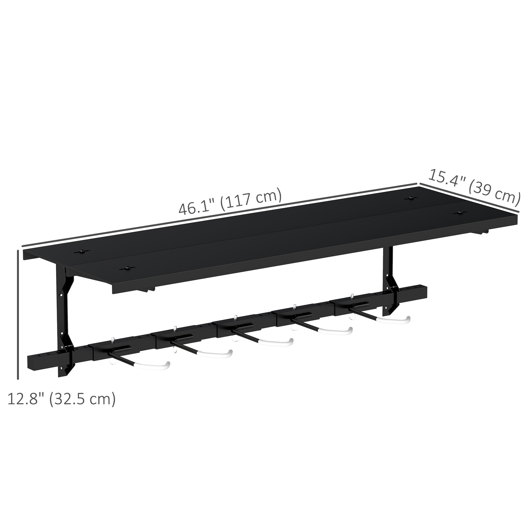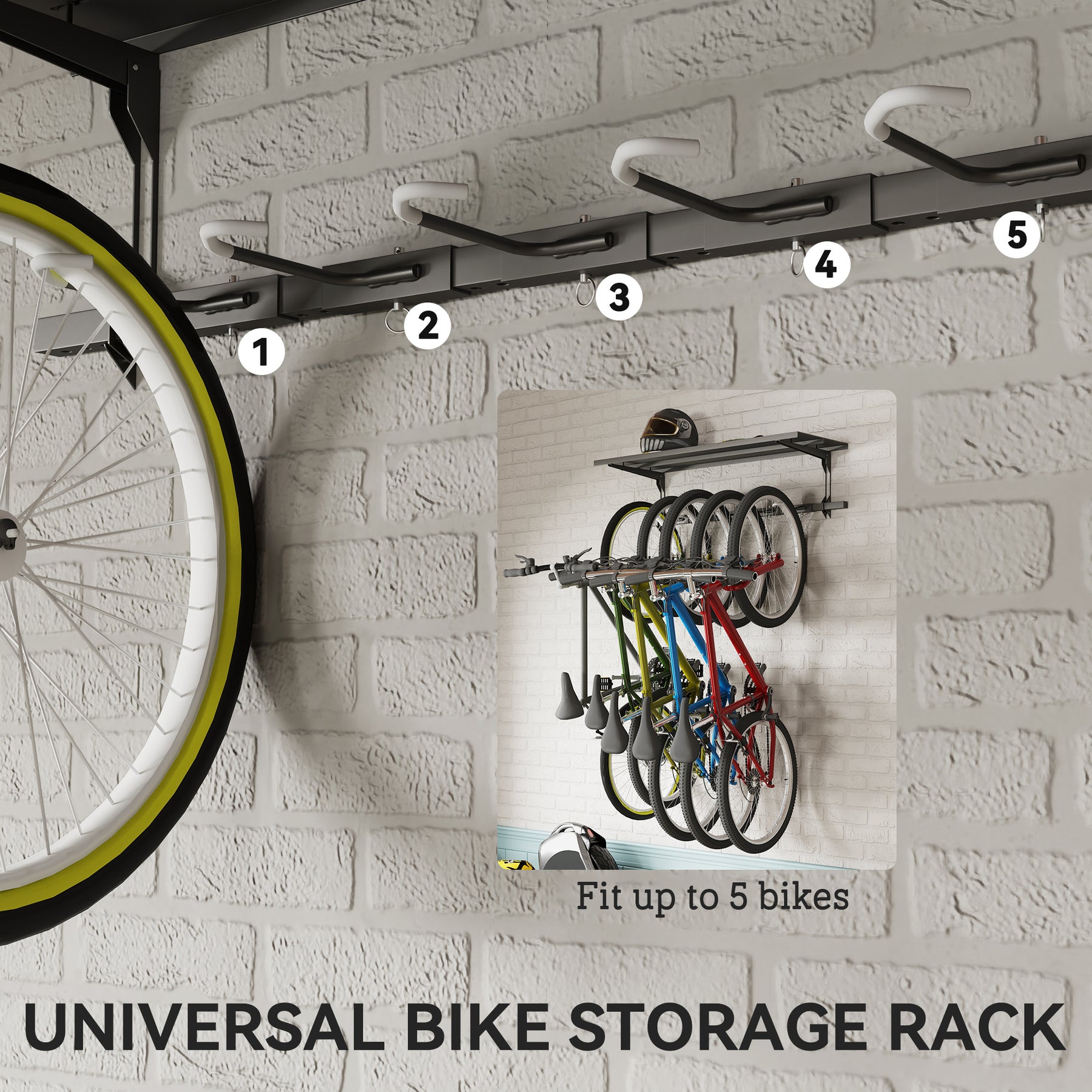 The Soozier bike rack is the all-in-one storage solution for all your bikes and equipment! With 5 heavy-duty storage hooks, you can hang road bikes, mountain bikes, recreational bikes, and family bikes right on the wall for space-efficient storage. The overhead storage shelf provides additional space to hold bike helmets, shoes, pumps, tools, and more! Clear up space in your garage and organize all your bikes and gear right on the wall with the bicycle rack!