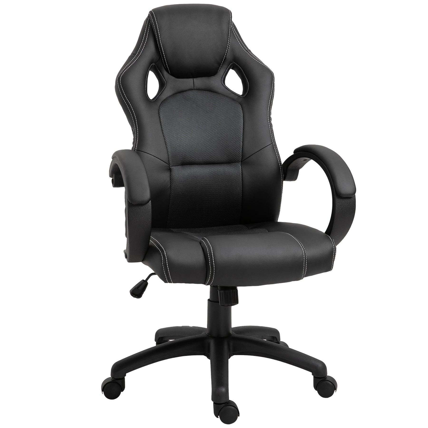 Have a seat on this sleek HOMCOM gaming chairs for adults and feel your productivity increase instantaneously. The racing gaming chair has the style of a sports car seat with all the needed comfort and function of a gamer computer chair. It features ergonomically-designed added head support, adjustable height, tilt mechanism and 360-degree swivel motion which will provide you with a perfect comfortable work area or gaming position. This high back office chair is a must have in your office!