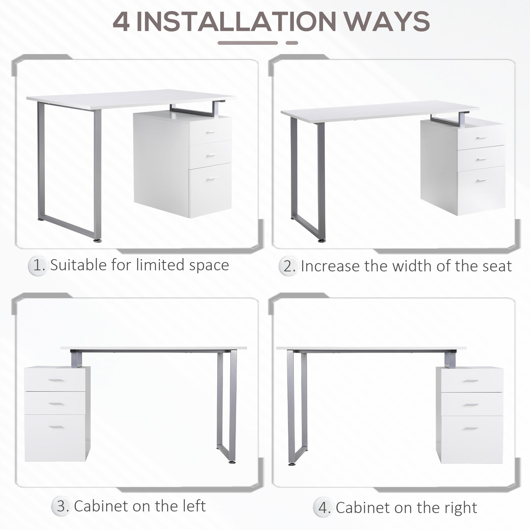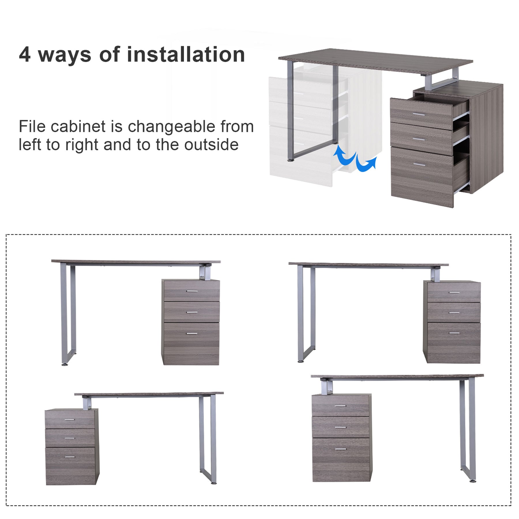 - • The file cabinet can be assembled on the left or right side, or even outside the desk. 4 ways to install this office desk to meet your different needs