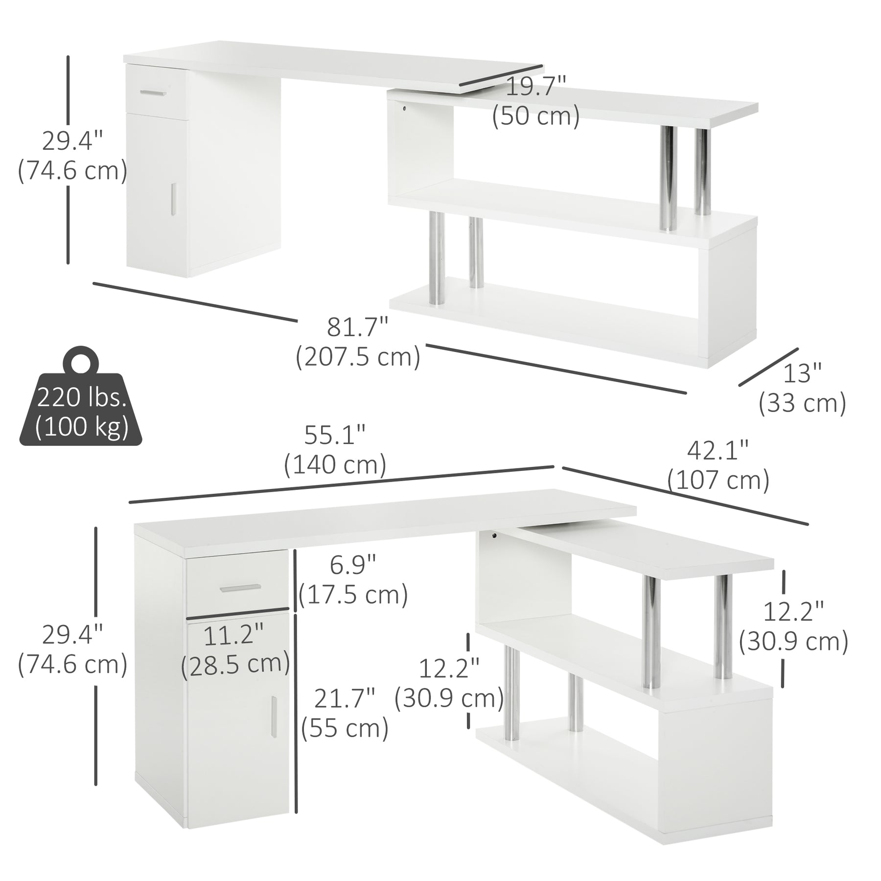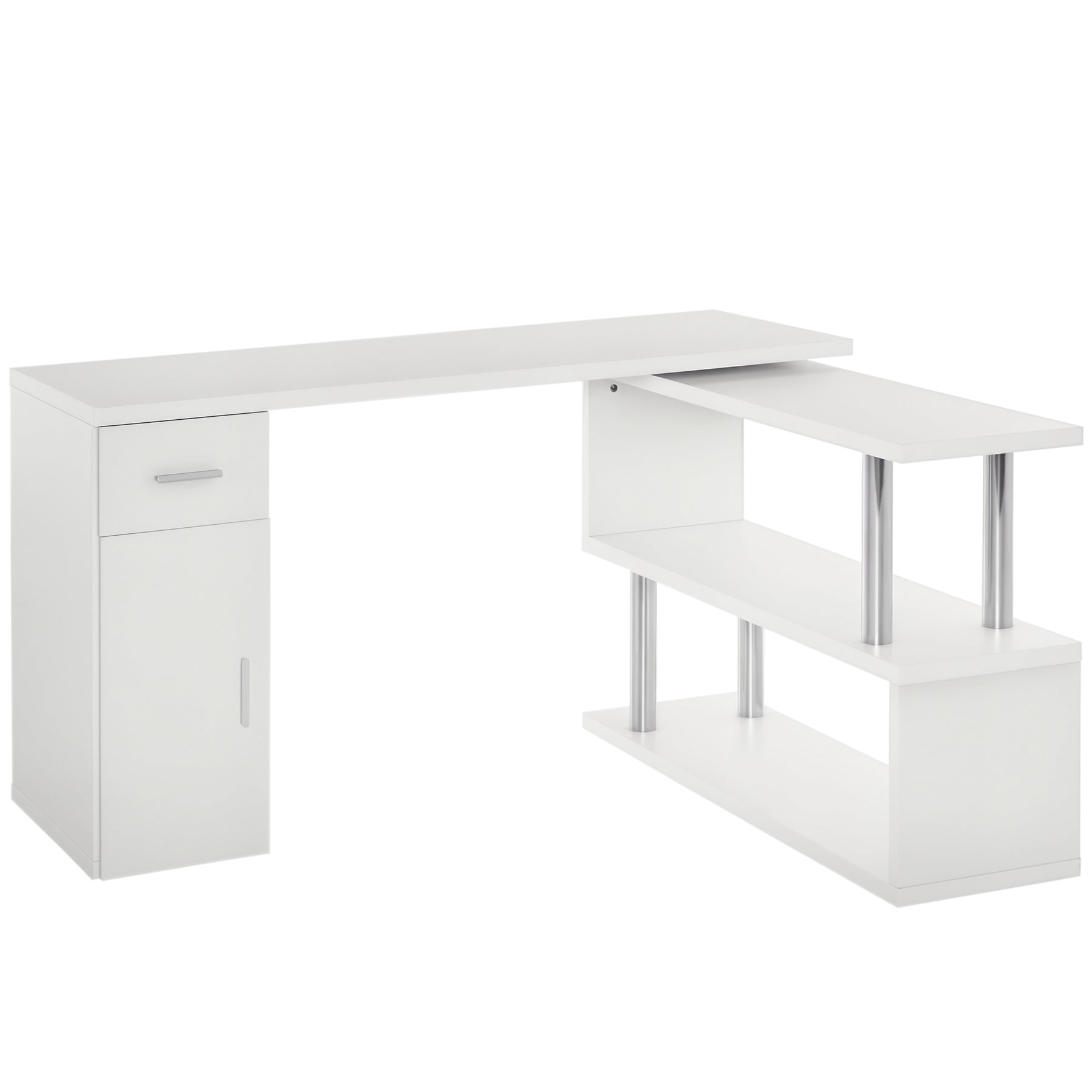 The HOMCOM L-shaped corner office desk features a unique rotating design that can be adjusted to your needs and contains plenty of storage space. As needed, the lL desk can convert to L-shape easily. The modern look adds a touch of class to your office or home and is crafted from high-grade engineered wood. A stylish corner office desk workstation, storage unit, and display case.