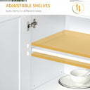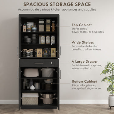 This kitchen pantry can fit various décor styles with a simple yet modern design. It has two large cabinets with doors to store your cookware and dishes. Also, it has a pull-out drawer to place your small accessories. With its compact design and excellent storage capabilities, the storage cabinet with doors and shelves will give you the space you need.