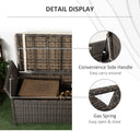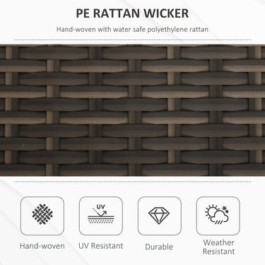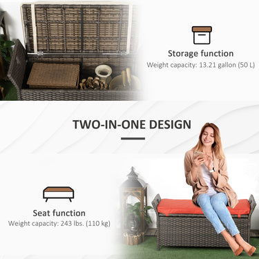 Outsunny offers a 2-in-1 high-capacity storage solution and a comfortable seat. This patio bench with storage is handwoven with PE wicker, offering the look of natural rattan with enhanced water resistance. The heavy-duty steel frame makes it hold weight without warping. With a soft cushion and two handles, it's easy to carry, making it suitable for seating and storing items in any outdoor area. Use this outdoor storage box for garden tools, deck or balcony essentials, or poolside supplies.