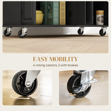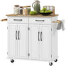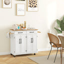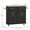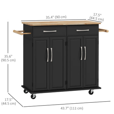 Transform your space with the HOMCOM kitchen island cart, where functionality meets farmhouse charm. Its spacious rubberwood countertop offers a stylish dining spot or extra counter space. Dive into convenience with storage galore - two drawers and cabinets, plus adjustable inner shelves to cater to all your needs. The smooth painted surface, paired with rolling wheels and handy towel racks, makes this the go-to kitchen island with storage, coffee cart, or microwave cart for any home.