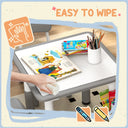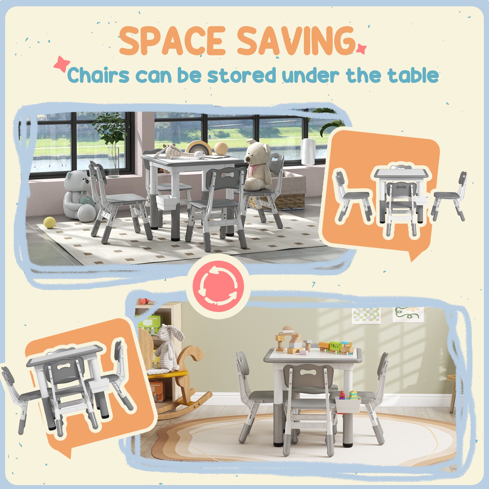 Welcome to the world of fun and creativity with the kids table and chairs set from Qaba! Designed for your child's enjoyment, this set includes a table and four chairs, great for play dates, homework sessions, and meals with friends. The adjustable height means that this set grows with your child, suiting their needs as they age. Your kids will feel like grown-ups with this feature, boosting their confidence and independence. The easy-to-clean surfaces allow for a hassle-free clean-up time.