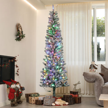 Light up your festive spirit with the HOMCOM pencil prelit Christmas tree, featuring LED lights with a remote controller. You can toggle between warm white and multi-colored hues, and choose from 11 enchanting lighting modes to set the excellent holiday ambiance. This frosted Christmas tree, dusted in magical artificial snow, flaunts a slim, pencil shape, making it a charming addition to small spaces or as a second tree in your entryway.