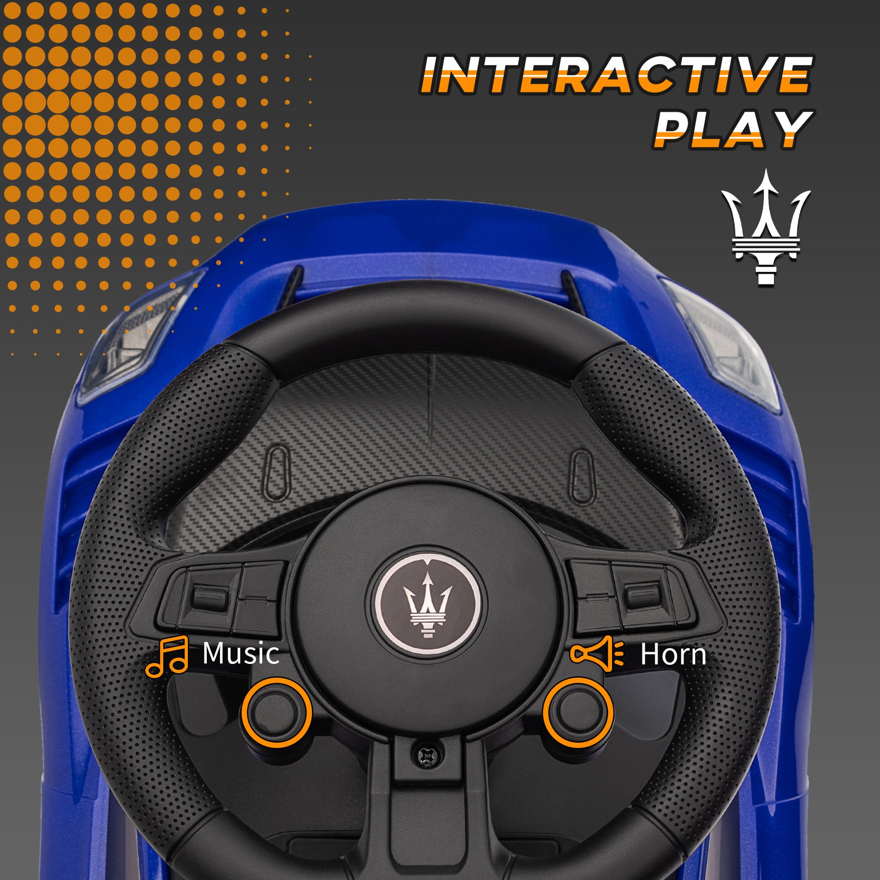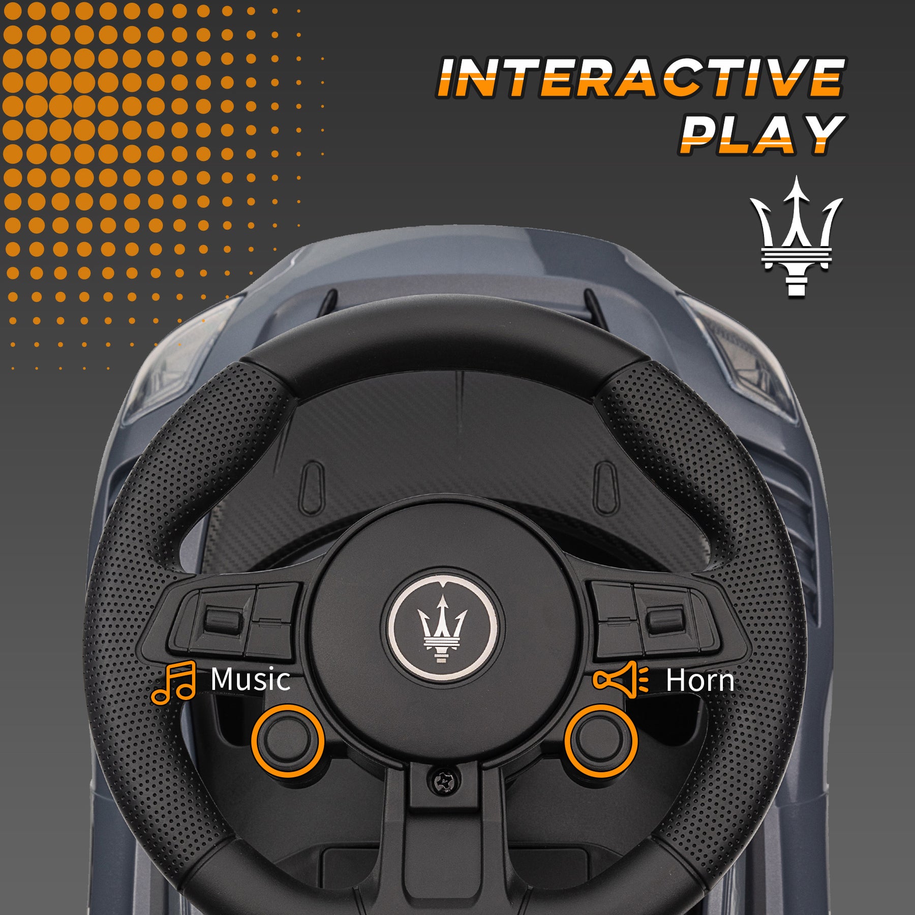 - • Horn and music buttons on the steering wheel for interactive play