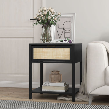 Need some more storage in your bedroom or other living areas? This HOMCOM accent nightstand is here to help. The rattan drawer front and gold finish handle create a contrasting and Boho look, something different for your home space. Made from MDF frame with melamine coating, the bed end table is sturdy, featuring a drawer and an open shelf, with a flat top: plenty to hold bedtime essentials. Move the side table with drawer anywhere you need it, and it's always at your service.