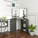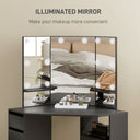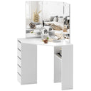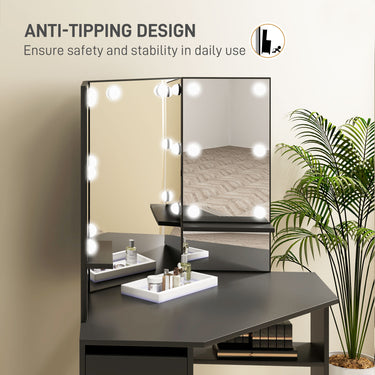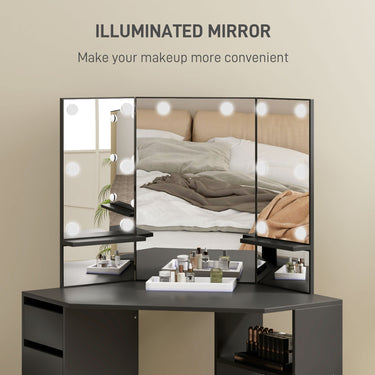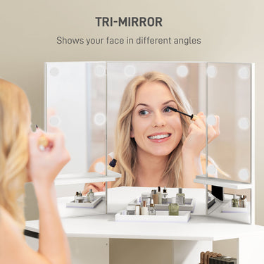 Get ready to glow with the HOMCOM makeup vanity desk! It features 10 LED bulbs for warm, flattering light and three mirrors for comprehensive angles. With ample storage options and a clever corner design, it's a stylish, space-saving solution for your beauty routine.
