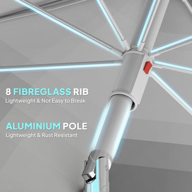 - • Aluminium pole and fibreglass ribs ensure robust stability