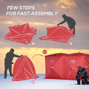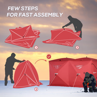 This Outsunny pop up ice shanty will provide you and your buddies with the ability to fish in the cold winter with comfort and warmth! Constructed with sturdy hubs, fiberglass poles, an extra heavy-duty zipper, a reinforced bottom, ground stakes, guy ropes, and removable windows, this ice fishing shack is designed to keep the cold breeze out. Ideal for 5-8 people, it is an optimal choice both for occasional ice fishermen and fishing enthusiasts!