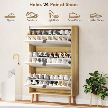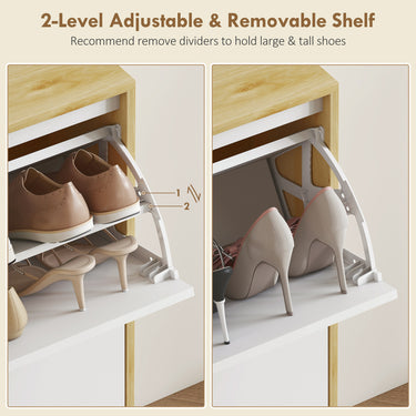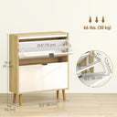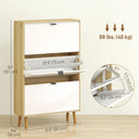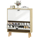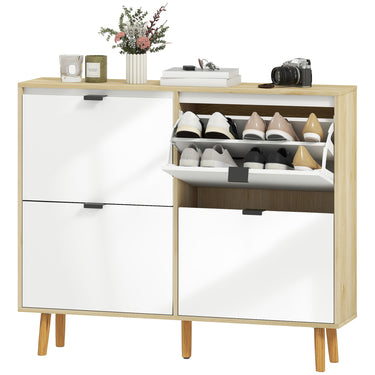 Transform your entryway with the sleek HOMCOM shoe cabinet. Its high gloss white doors and oak wood effect frame add a modern touch, while the finger edge pulls ensure easy access. With four flip drawers and adjustable shelves, this shoe storage cabinet neatly organizes up to 20 pairs of shoes. Make every arrival and departure a little more enjoyable with a clutter-free, beautifully designed entryway.